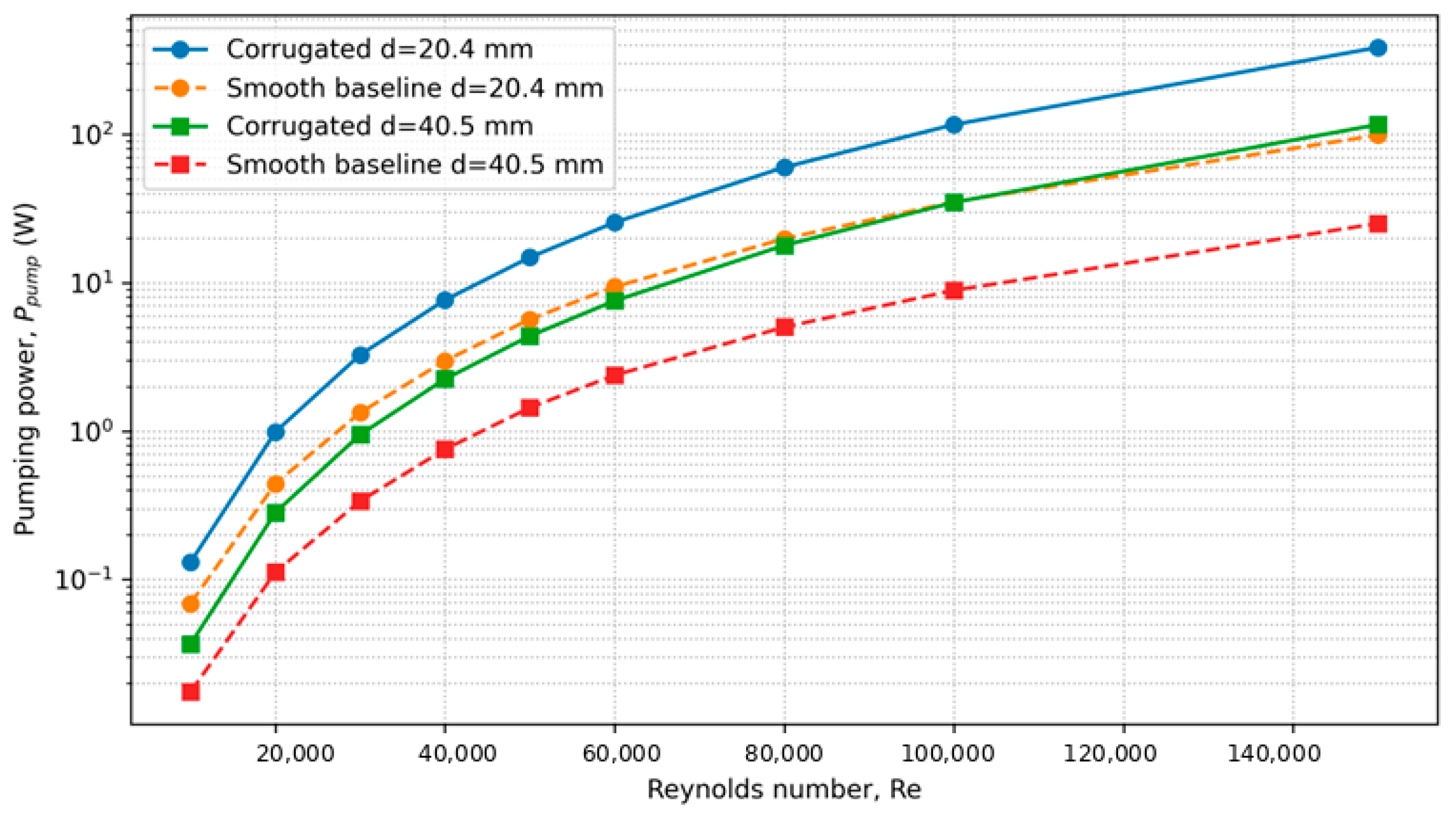 Using the pressure losses obtained from the CFD simulations, the pumping power was evaluated for corrugated pipes of different inner diameters operating under dynamically similar Reynolds-number conditions. The variation of pumping power with Reynolds number is presented in
