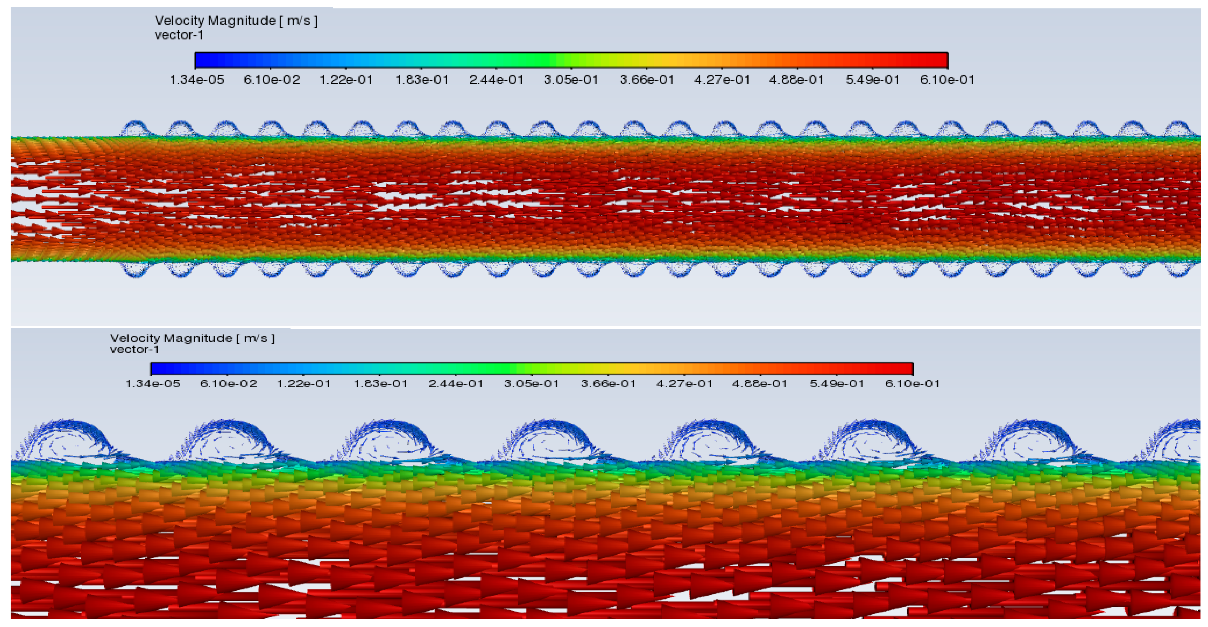 17], many numerical investigations continue to rely on idealized channel representations or equivalent roughness-based surface models. In the present work, this limitation is explicitly addressed by resolving the full corrugation geometry within the computational domain, thereby enabling direct capture of groove-scale separation, reattachment, and vortex dynamics that govern diameter-dependent hydraulic losses.
