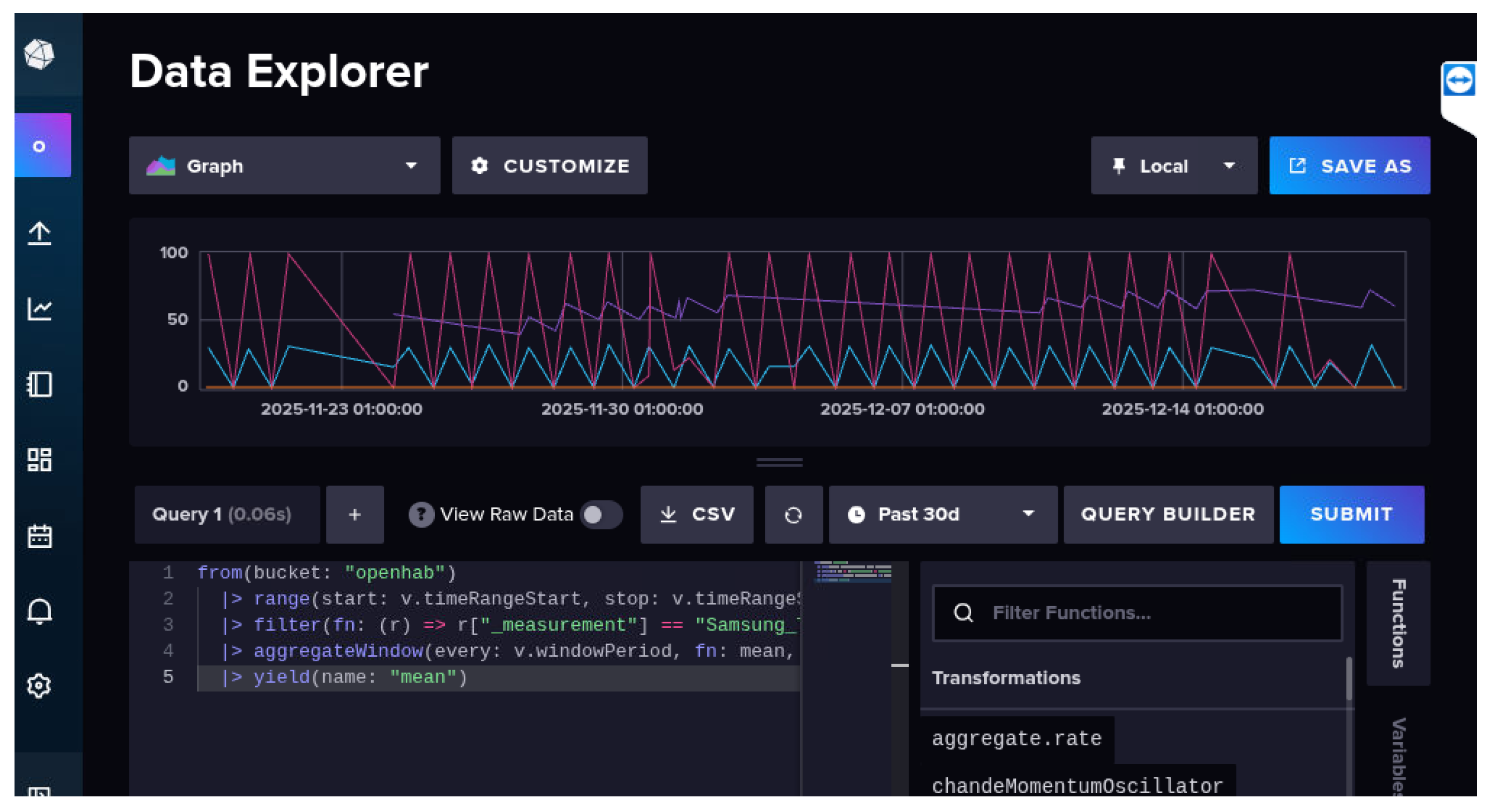 The starting point when introducing InfluxDB was not as low-level as in the previous development stages. Since the z-distribution-based approach has already proven useful, the primary goal was to port the existing functionality to the new platform and adapt it to its specific characteristics. The connection between OpenHAB and InfluxDB is conceptually similar to that of MariaDB; the major differences lie in how data is organized and manipulated. Influx is structured around the concepts of organizations and buckets, which, in a simplified sense, correspond to databases and tables in relational systems. Unlike MariaDB, InfluxDB provides an integrated management environment and therefore does not require external add-ons such as PhpMyAdmin. The platform is based on a built-in graphical web interface that supports a variety of data visualization and manipulation. For more sophisticated programming tasks Influx provides an integrated Query Builder based on a code view. Both the graphical interface and the code-based processing support various connections to external systems. However, the version used in this work (InfluxDB 2), which is currently the only version integratively supported by OpenHAB, relies on the proprietary data manipulation language Flux and other proprietary concepts.
