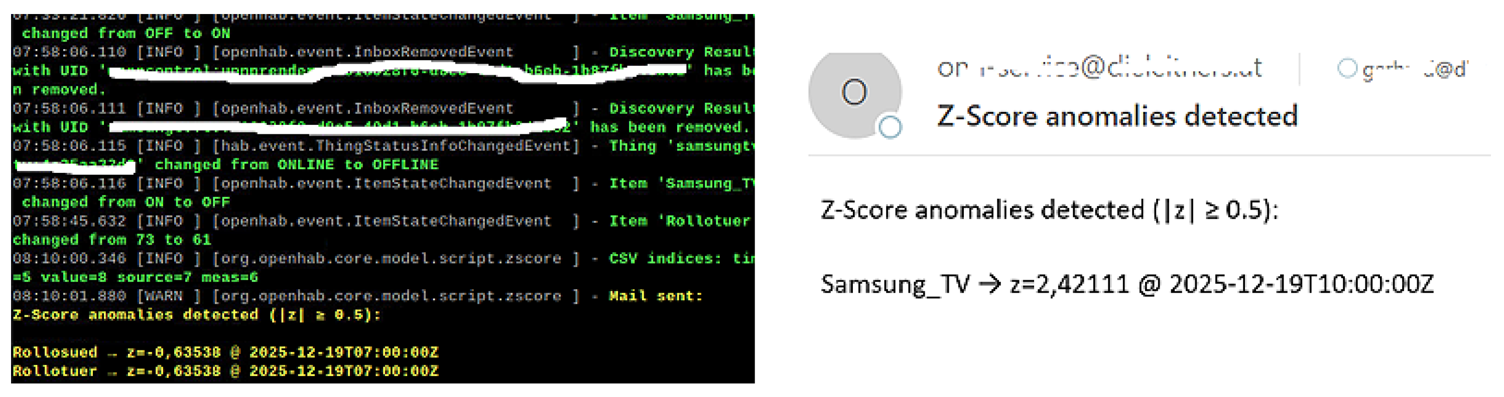 In the first step, the data in MariaDB was recalculated and normalized using the z-transformation, and the results were subsequently written to separate data tables. The resulting data is characterized by constant features (mean = 0, standard deviation = 1). Again, the goal was to determine the difference between the number of manual triggers observed in the most recent hour and the typical trigger frequency in the same hour of the day in the past. The z-distribution enables the identification of deviations based on calculated z-values, which express the statistical distance from expected behaviour. Deviations are commonly interpreted in terms of standard deviations (). Depending on the desired sensitivity of the algorithm, absolute z-exceeding a threshold of 2 (i.e., z > 2 or <) can be regarded as statistically significant deviations. The computation of the z-values and the assessment of deviation significance were performed using the aforementioned stored procedures. These procedures can be understood as programs providing enhanced functionality directly within the database system. They can be executed locally, require no external computational resources, and run automatically at predefined intervals. Compared to the earlier cron/rule combination, this mechanism offers substantially greater stability (because it runs decoupled from the smart home runtime), flexibility and supports more complex processing logic.