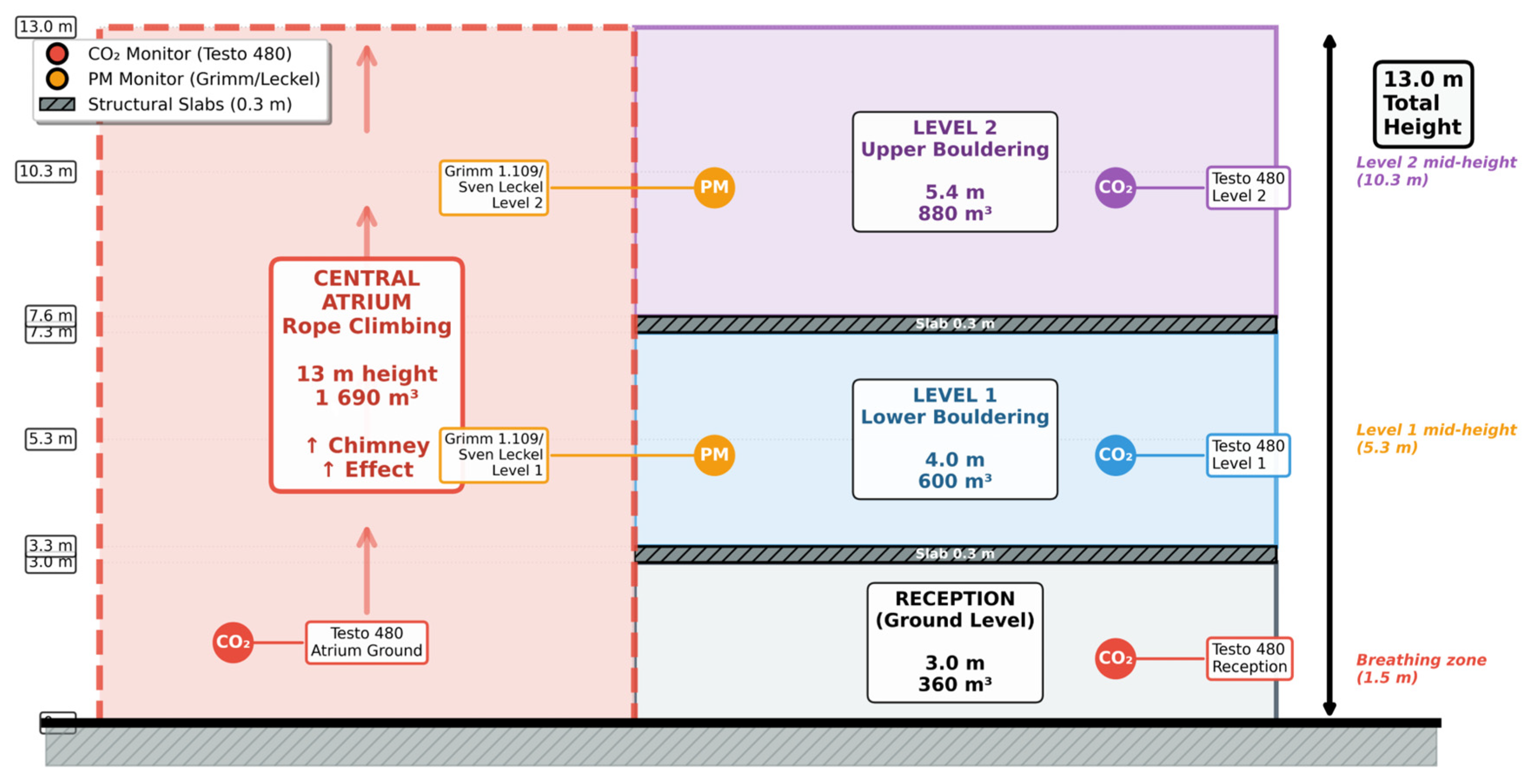 6], the environmental implications of exercising in these enclosed spaces remain insufficiently characterized. Climbing gyms feature distinctive architectural configurations: large vertical volumes (10–15 m), multi-level bouldering zones, and moderate occupancy densities (0.15–0.25 persons m