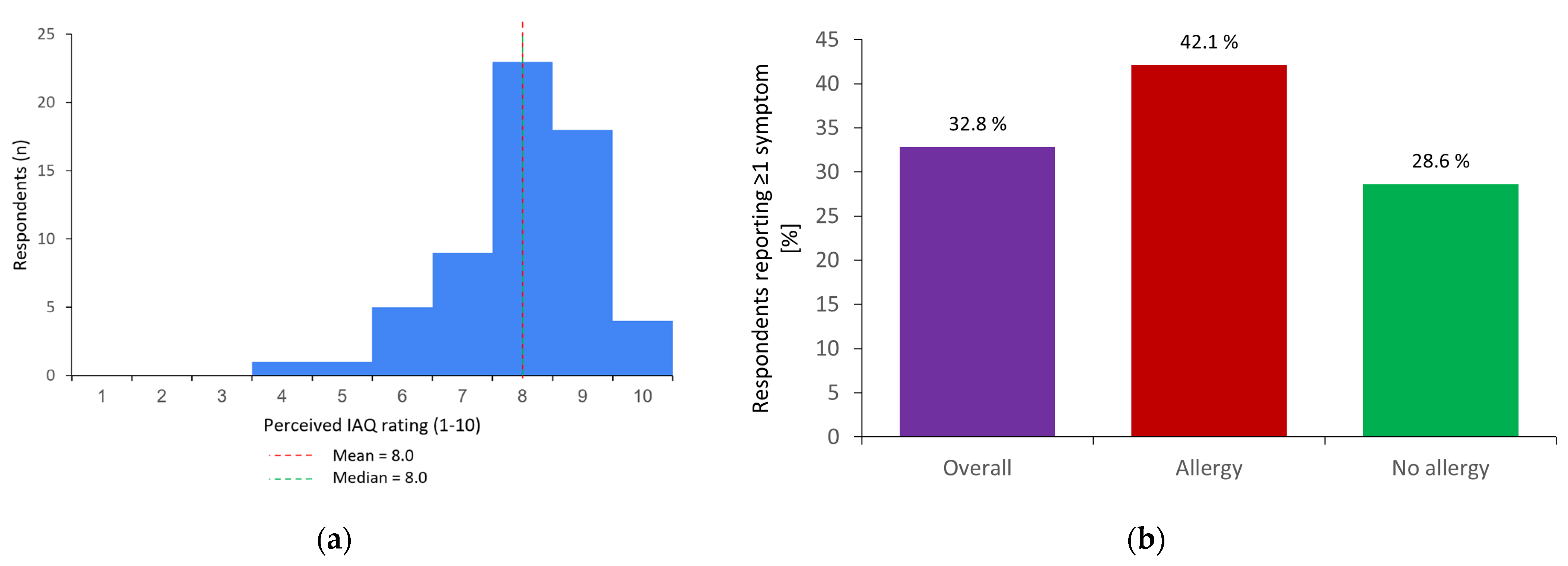 Despite the objectively high concentrations of particulate matter, the responses to the questionnaire revealed a substantial gap between perception and reality. Most of the users rated the indoor air quality as good or particularly good, and subjective evaluations showed only a weak correspondence with measured pollutant levels. Statistical analyses reinforced this observation, indicating that the perception–reality gap was consistent between user groups and that individual characteristics, including respiratory sensitivity, did not significantly improve the ability to detect chalk-derived aerosols. Even symptomatic respondents continued to provide overall positive IAQ ratings, underscoring the limited sensory detectability of mineral particulate matter at the concentrations observed and highlighting the need for evidence-based operational strategies for effective indoor air quality management.