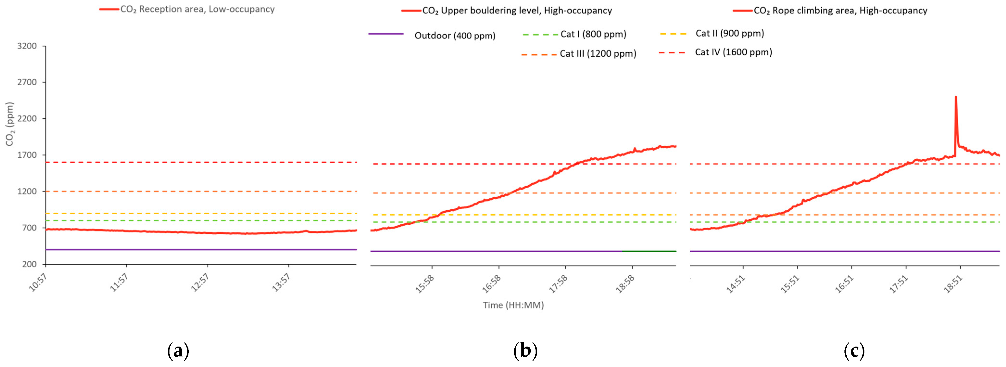 2 in an open-plan indoor climbing gym, evaluated the performance of the mechanical ventilation system under operating conditions, and linked objective exposure metrics with user perception. Through a comprehensive multi-zone assessment that integrates continuous monitoring of PM and CO