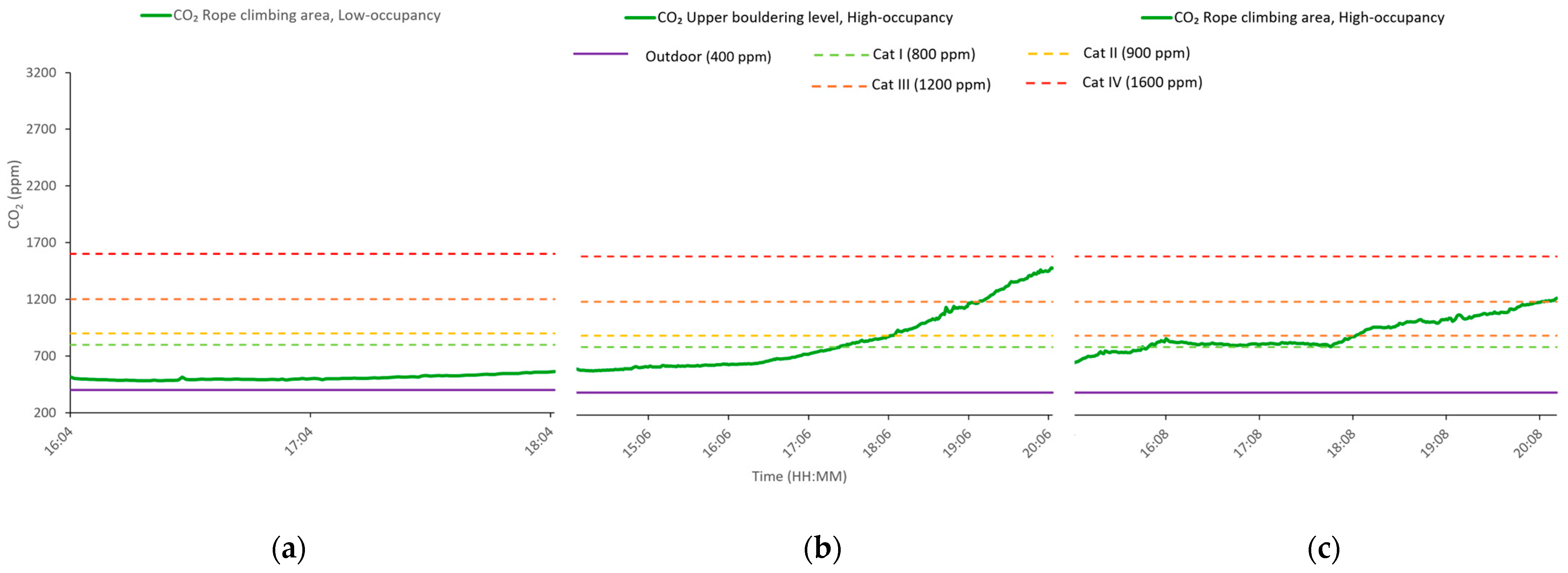 Carbon dioxide concentrations showed a strong dependence on occupancy and ventilation regime but exhibited near-uniform vertical distribution across the monitored volume, reflecting effective large-scale air mixing driven by activity and architectural features. In contrast, the behavior of particulate matter was more complex and strongly influenced by resuspension, deposition, and ongoing internal generation. These findings confirm that CO2 cannot be used as a proxy for particulate exposure in indoor climbing gyms within the conditions observed in the investigated facility.