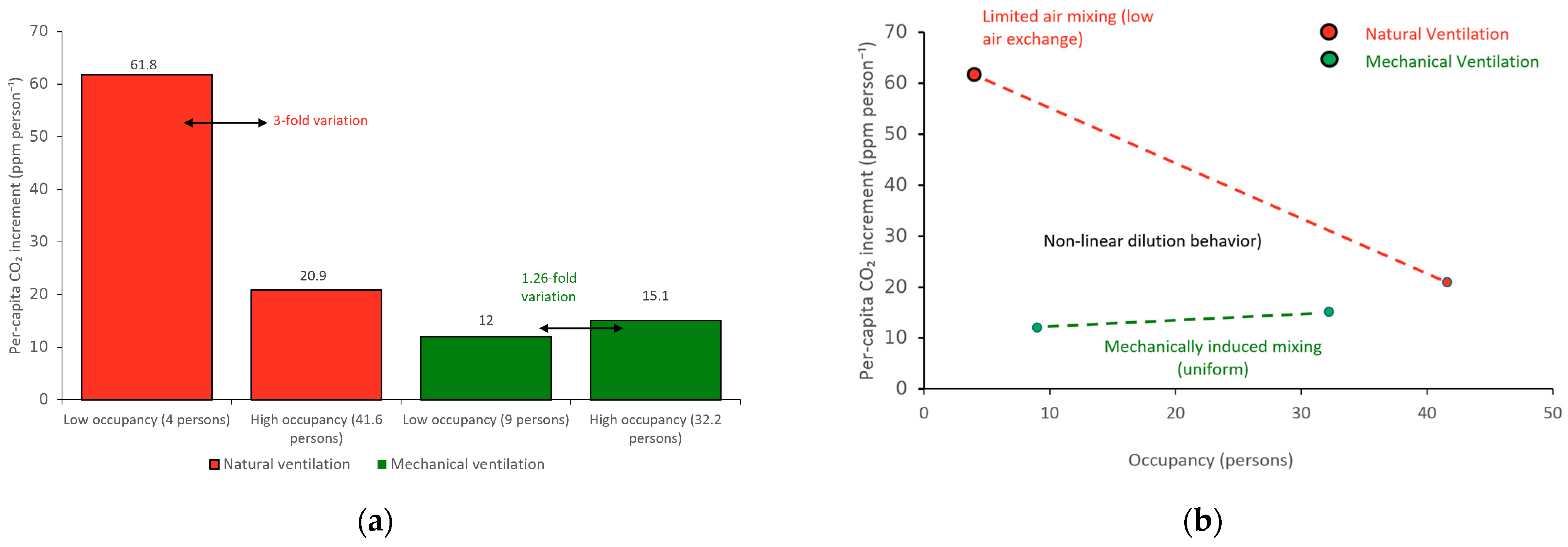 41]. These filters provide limited removal of fine and ultrafine fractions. A heat recovery air exchange unit on the upper level remained inactive during the study; fresh-air exchange occurred exclusively through incidental infiltration. The term ‘mechanical ventilation’ is used throughout to denote forced air recirculation without outdoor-air fraction, distinct from supply ventilation systems that introduce outdoor air. During the mechanically ventilated scenario, systems operated at the high airflow setting (10 m
