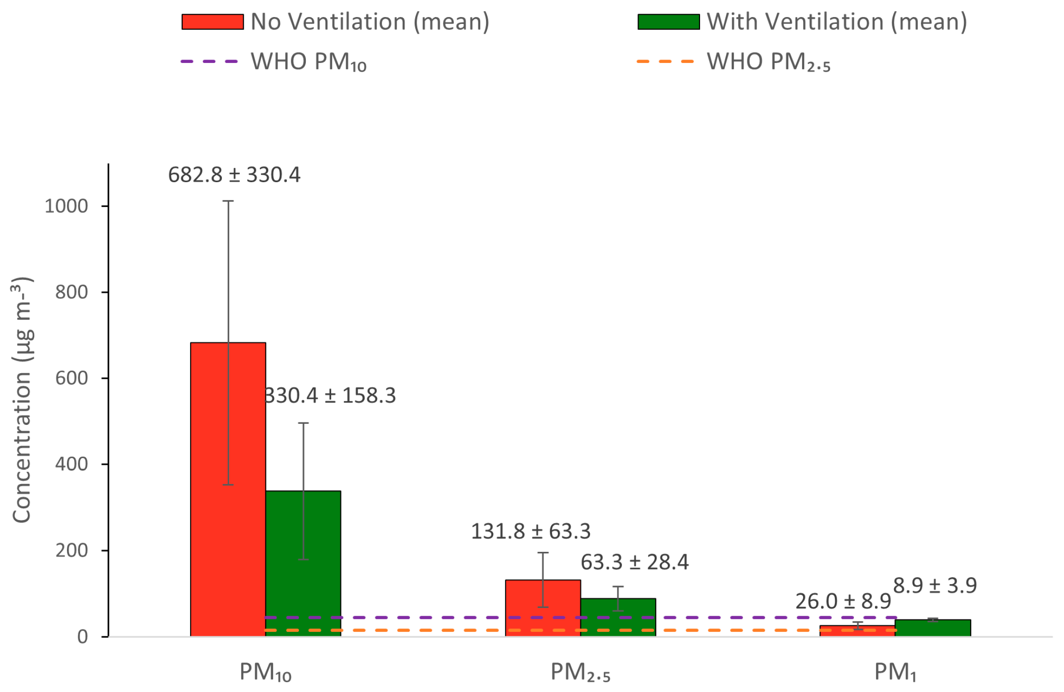 1 measured during high-occupancy active climbing periods under conditions of no-ventilation (red bars) and mechanical ventilation (blue bars). Horizontal dashed lines indicate the values of the WHO 24 h air quality guideline for PM