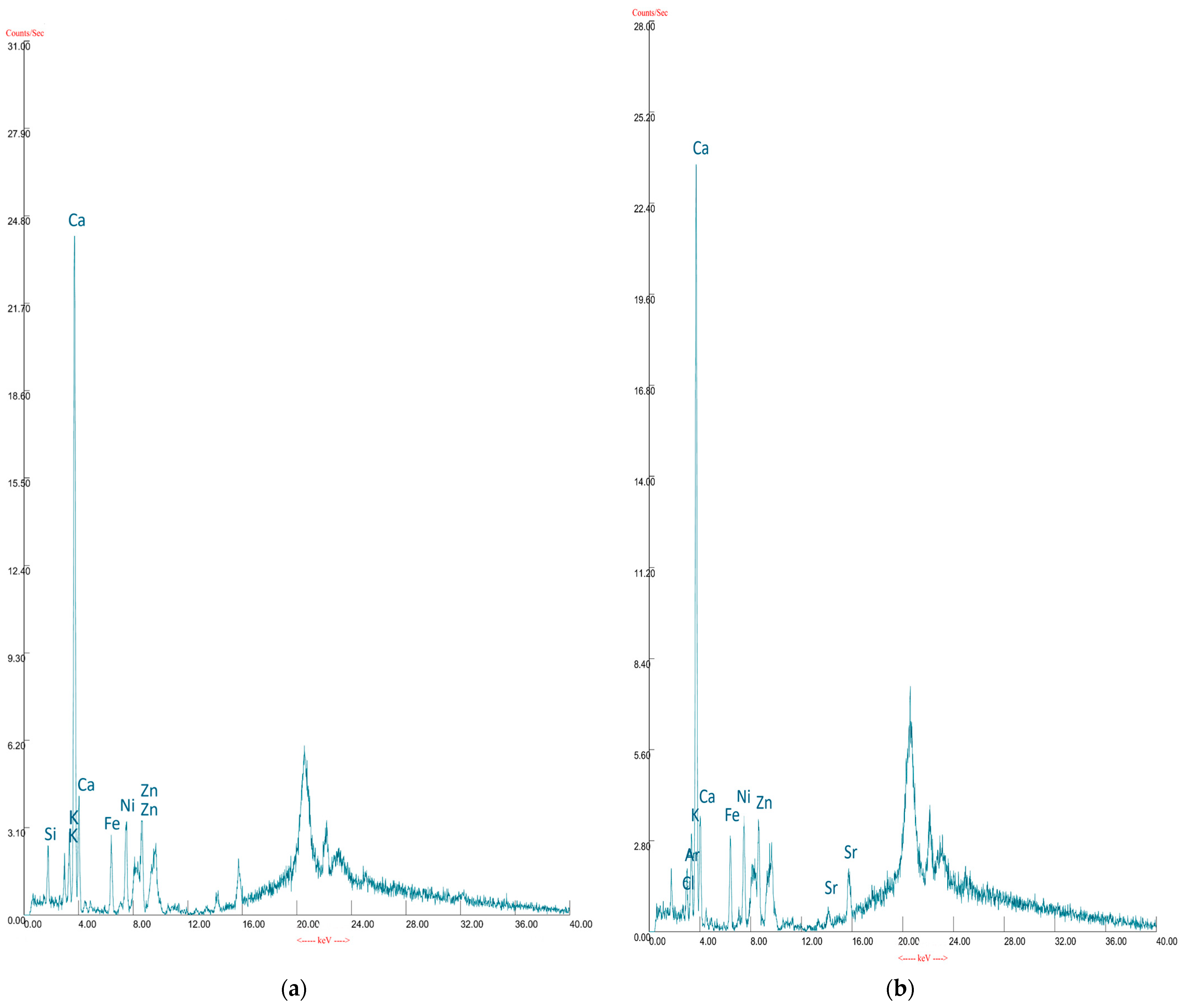 10 confirmed Ca, K, Fe, Zn, Ni, with minor Sr and Cl, while Ar lines reflected the ambient measurement environment. The PM