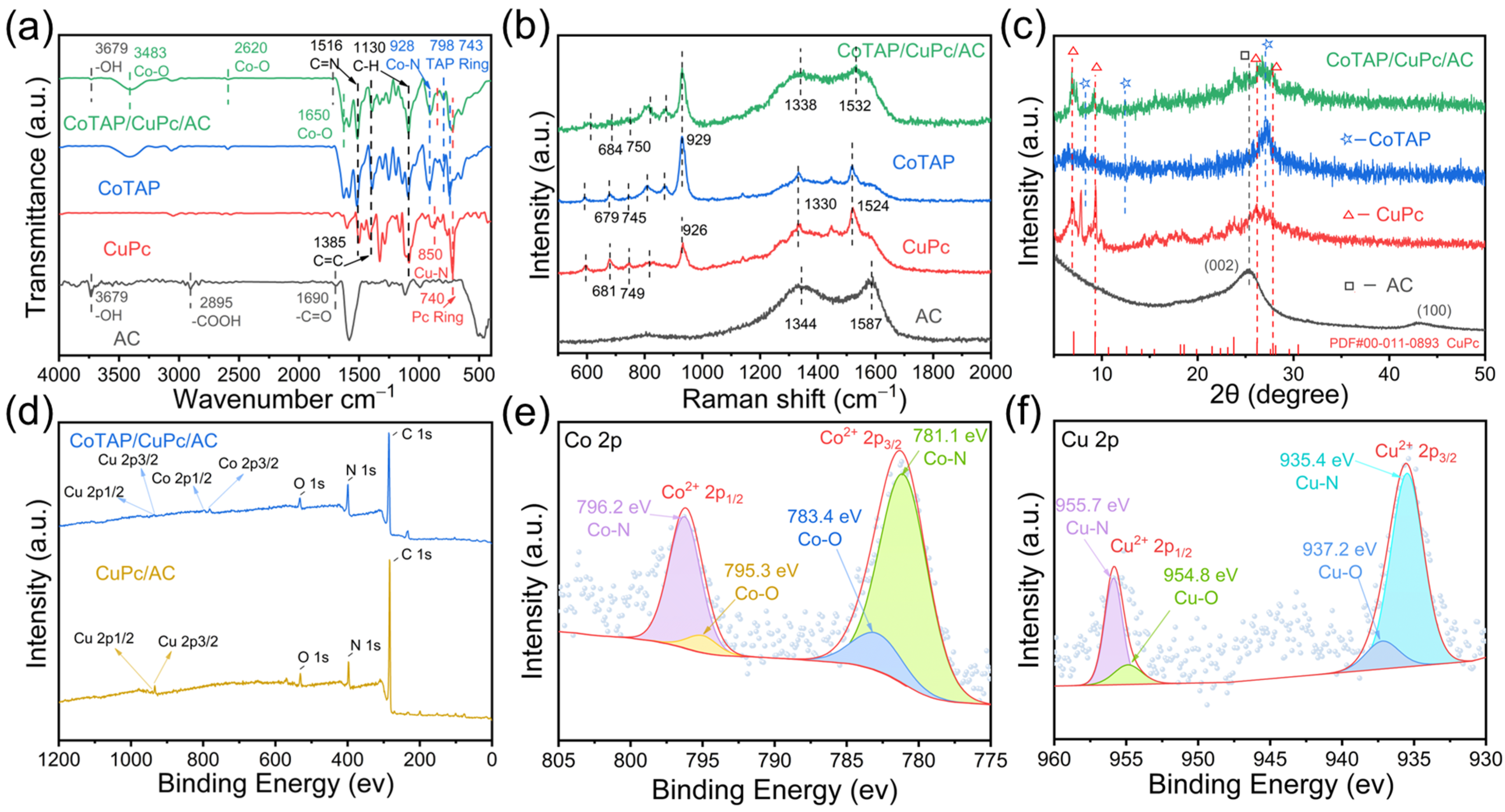 Figure 2a shows the FTIR spectra of AC, CuPc, CoTAP, and CoTAP/CuPc/AC composite. The FTIR spectra of CoTAP/CuPc/AC and CoTAP exhibit characteristic bands at 743, 798, and 928 cm