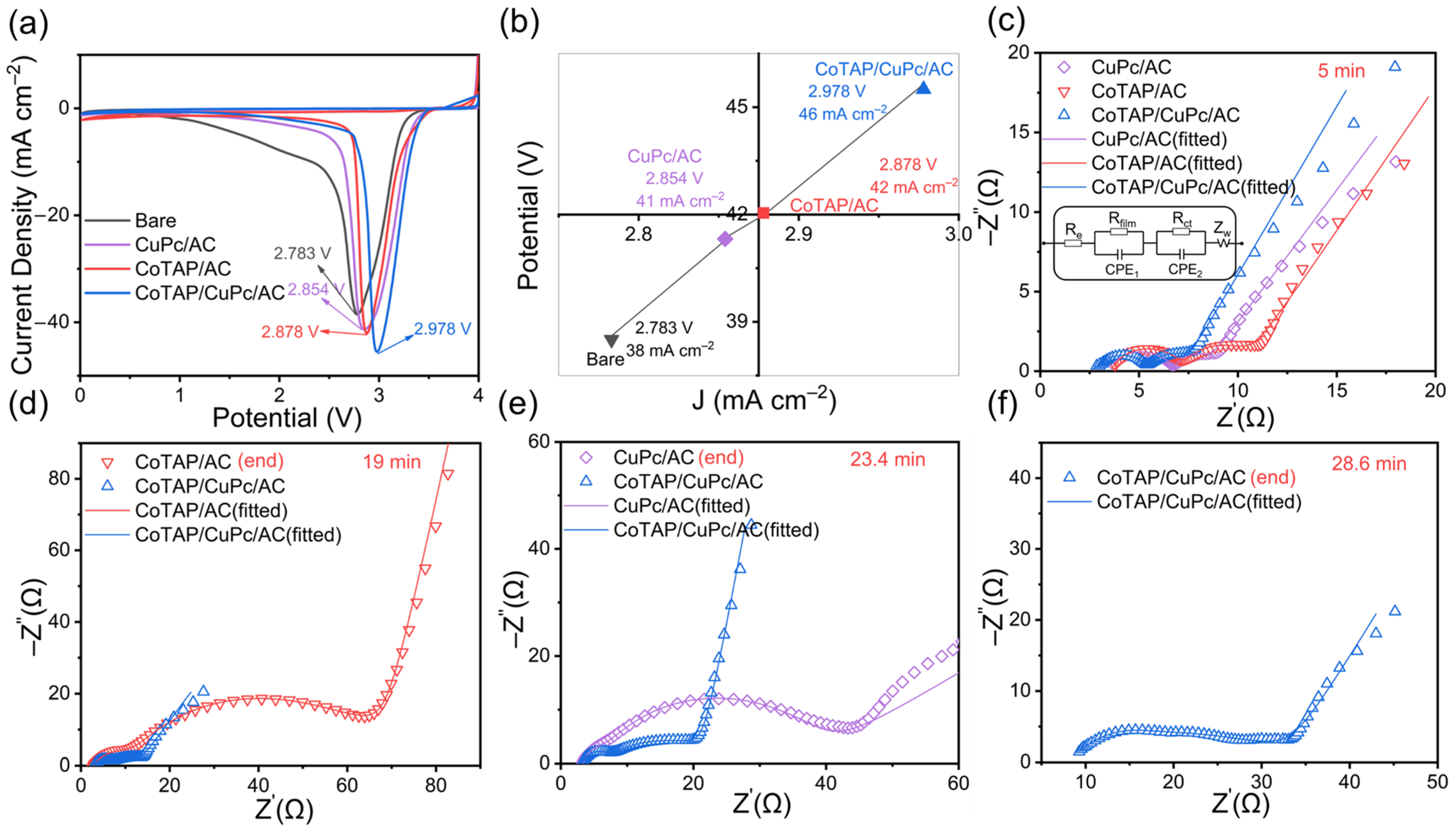 ct) of 37.35 Ω, which is considerably lower than that of the CoTAP/AC-catalyzed battery. However, the total impedance of the CoTAP/CuPc/AC-catalyzed battery was only 18.24 Ω at this stage. The battery incorporating the CoTAP/CuPc/AC composite exhibited a sustained discharge duration of 28.6 min (