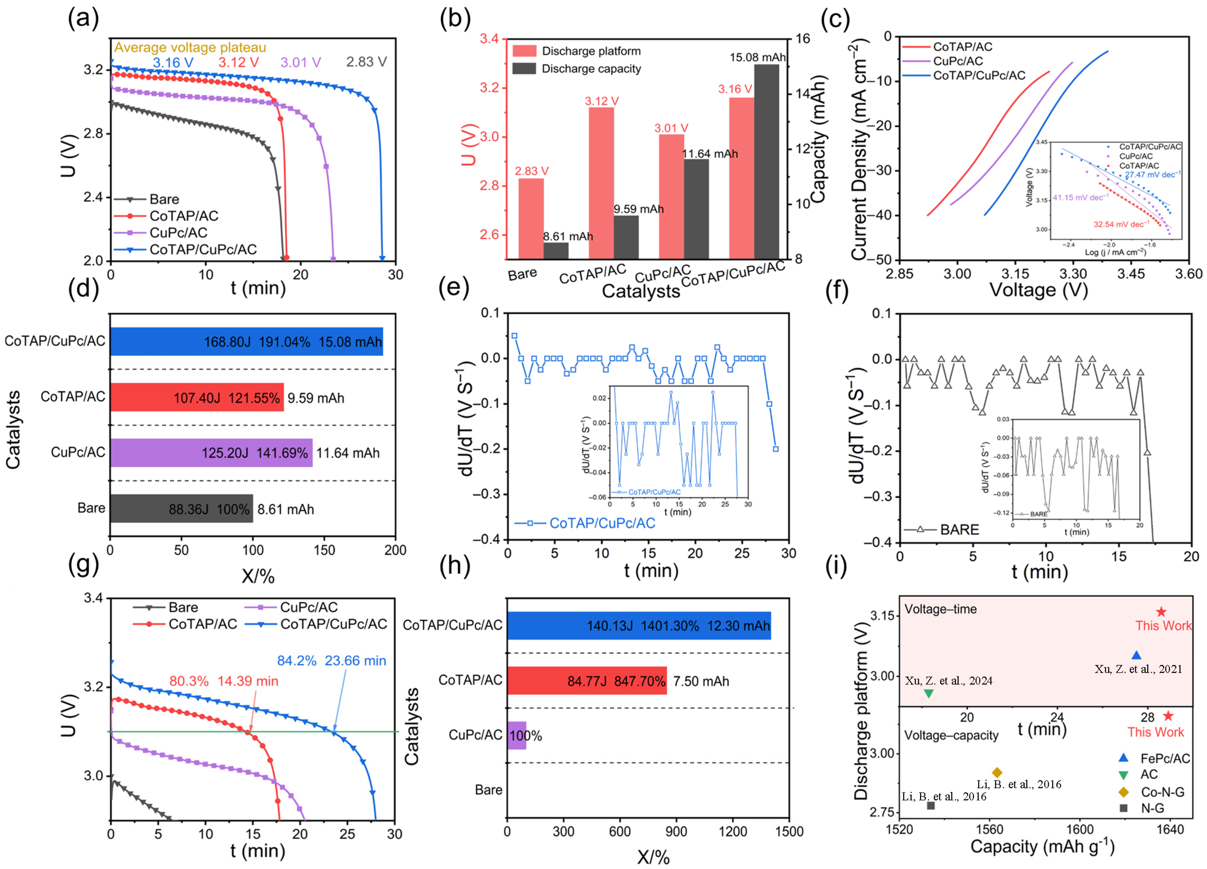 Figure 7g. The battery catalyzed by CoTAP/AC kept its voltage above 3.10 V for 14.39 min. When CoTAP/CuPc/AC served as the catalyst, this duration was extended to 23.66 min, the longest among all tested batteries. The relative energy of Li/SOCl