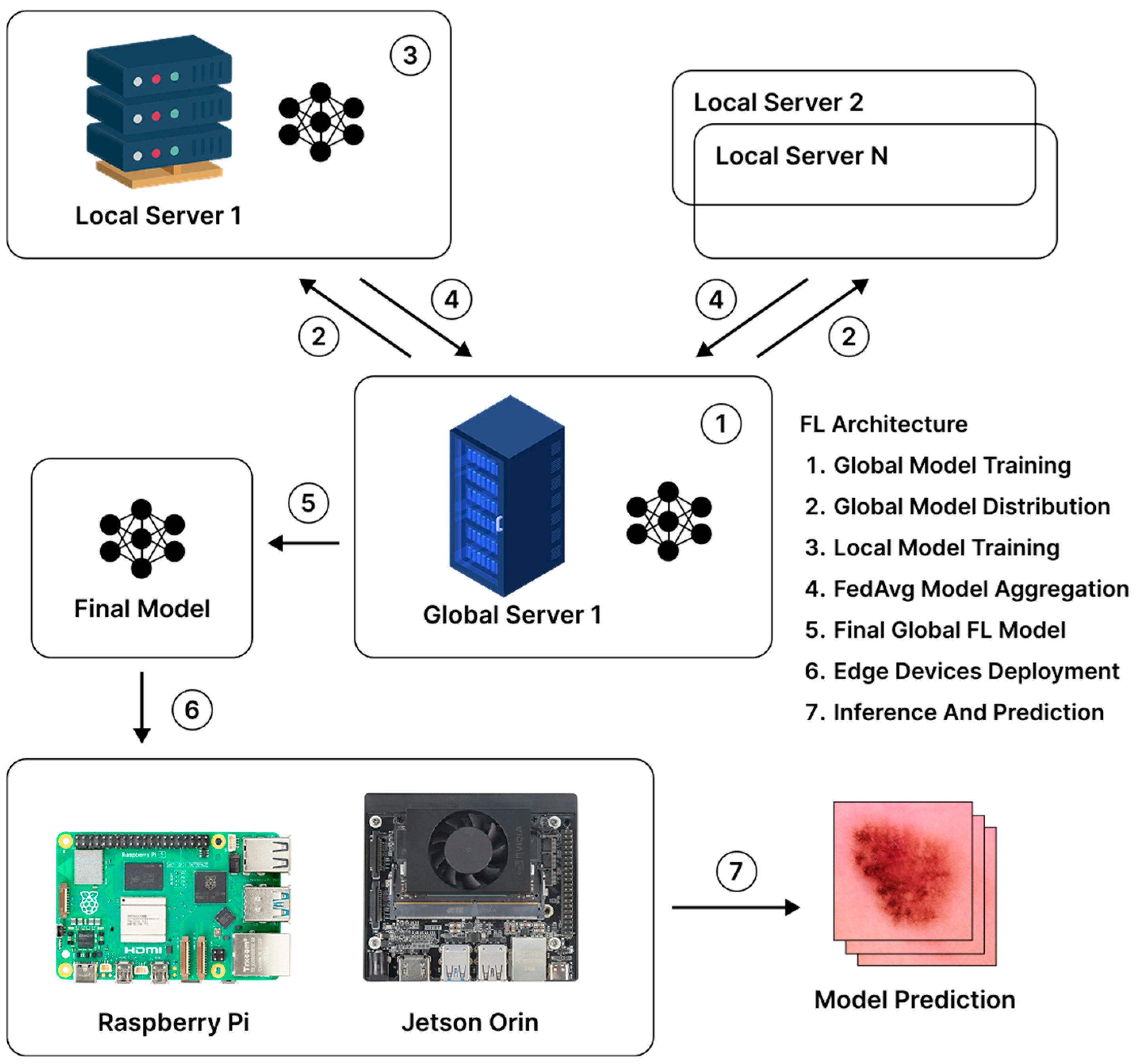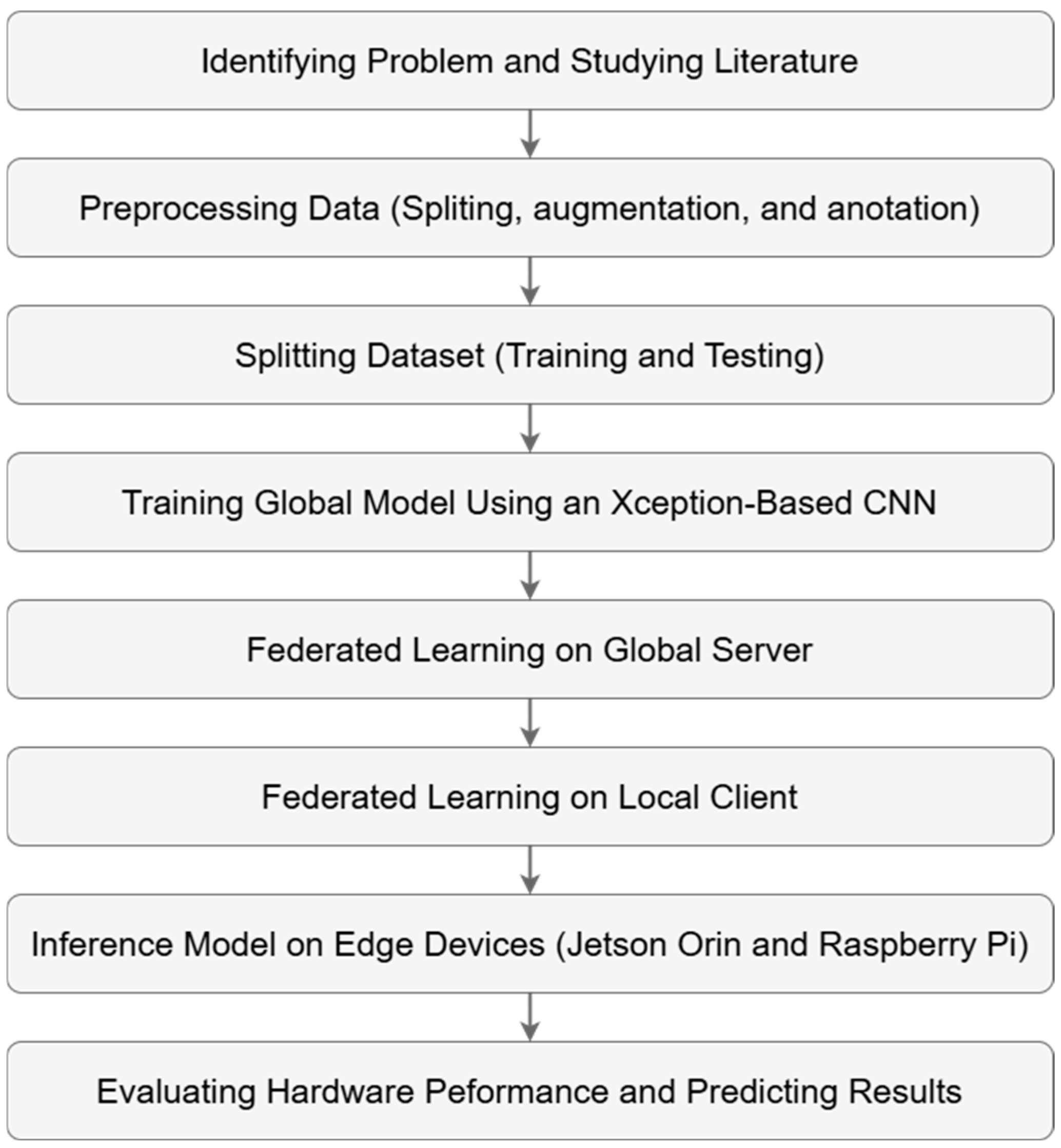 The dataset is divided into training and testing sets. In the next stage, a local model is trained using an Xception-based model, which is then used to initialize the global model in the Federated Learning architecture. The global model is evaluated using F1-score, precision, and recall to measure its performance. The Federated Learning process consists of one global server and two local servers. After several federated learning iterations, the most optimal model is selected and subsequently deployed on edge computing devices, such as Jetson Nano and Raspberry Pi (Raspberry Pi Ltd., Cambridge, UK), to assess its feasibility on low-power hardware. The final stage involves evaluating both the hardware performance and the federated learning model using several measurement parameters.