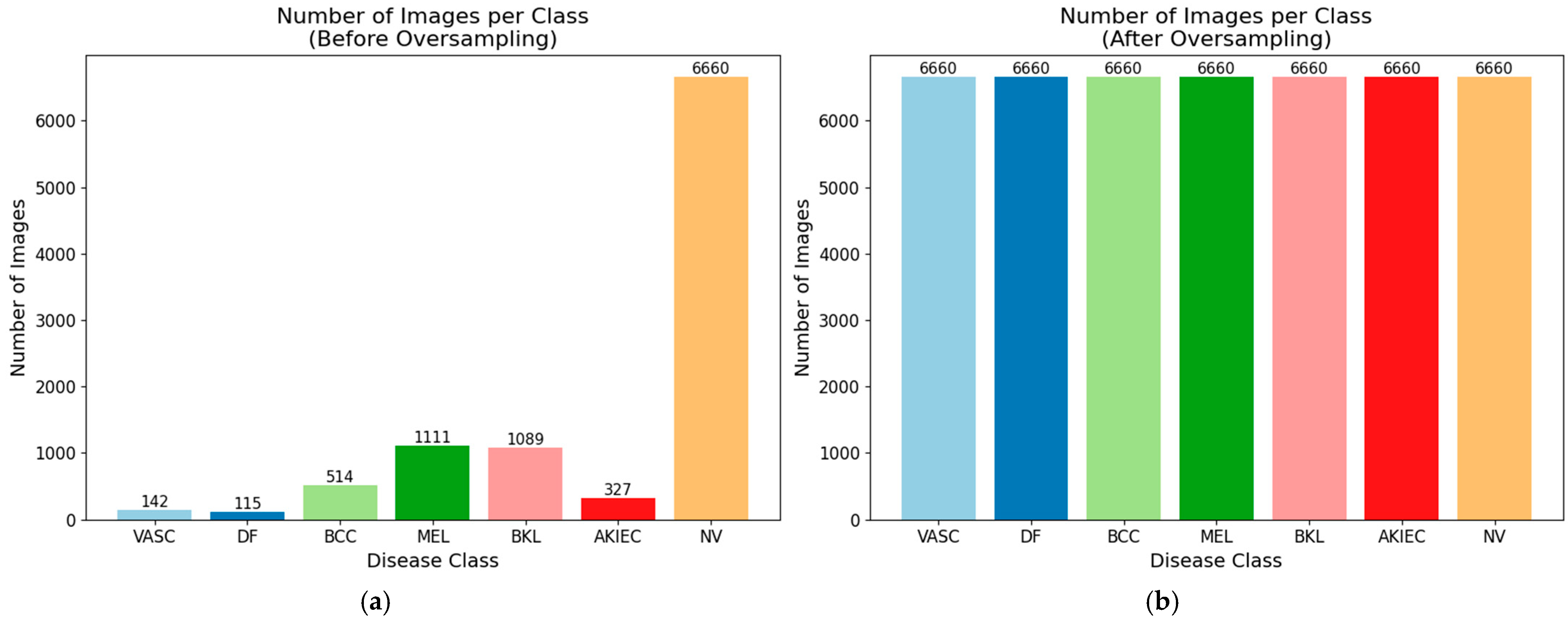 Figure 5 presents a comparison of class distribution after data cleaning and illustrates the changes before and after applying data augmentation and random oversampling. The left plot demonstrates a substantial imbalance among classes, where certain classes such as NV contain significantly more images than others. After preprocessing, as shown in the right plot, the number of images in each class is balanced. By applying these preprocessing steps, the dataset becomes more balanced, normalized, and diverse, thereby reducing overfitting and improving the model’s capability to perform skin cancer classification.