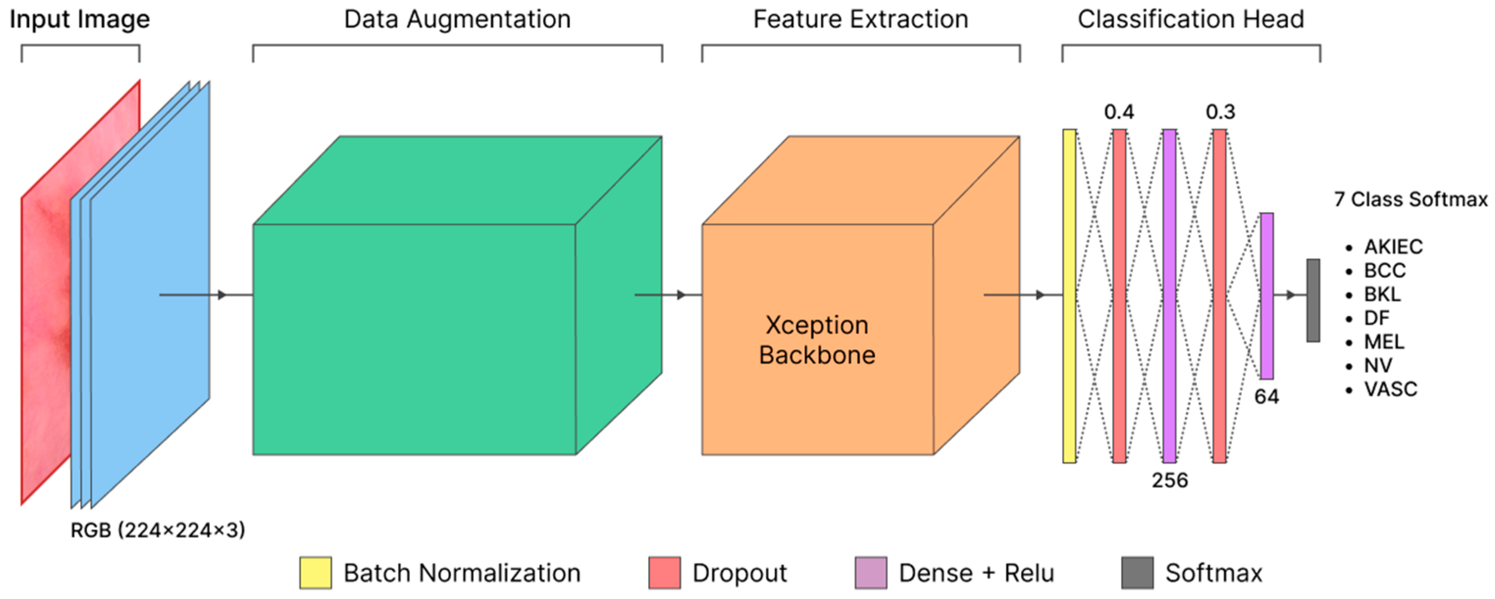Figure 6 shows the Xception-based CNN architecture. Model Xception as the backbone for feature extraction, followed by a classification head consisting of Batch Normalization, a Dropout layer with a rate of 0.4, a Dense layer with 256 neurons using ReLU activation and L2 regularization, and a Dropout layer with a rate of 0.3. Subsequently, the network is reduced using a Dense layer with 128 neurons, ReLU activation, and L2 regularization, followed by a final Dense layer with a Softmax activation function for multi-class classification across seven classes.