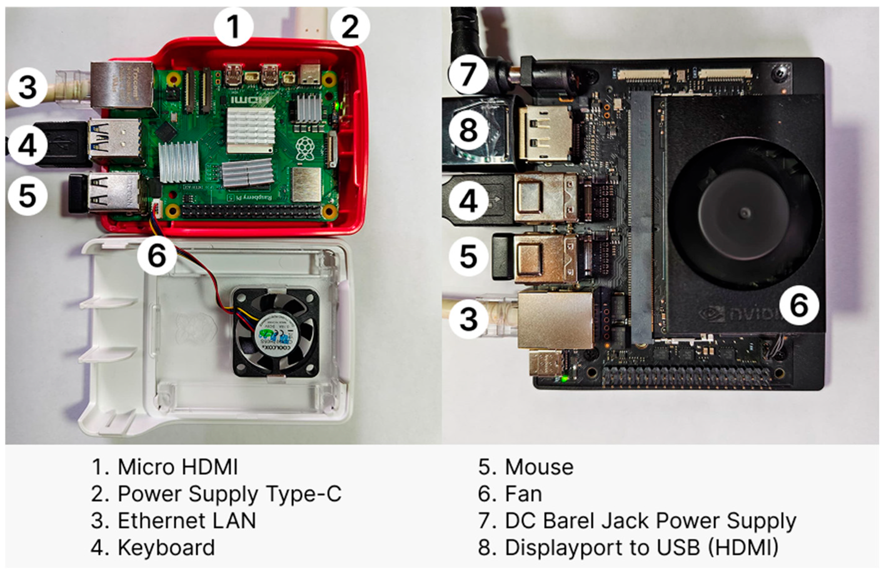 Figure 1. On the Jetson Orin device, several supporting components are used, including a 9V–19V DC power adapter via USB Type-C, a LAN cable, and a standard HDMI cable for connecting to a monitor. Meanwhile, on the Raspberry Pi device, a 5V/5A DC USB Type-C power adapter, a LAN cable, and a micro HDMI cable are used. For the installation and initial configuration process, an internet connection is established using a LAN cable, as illustrated in