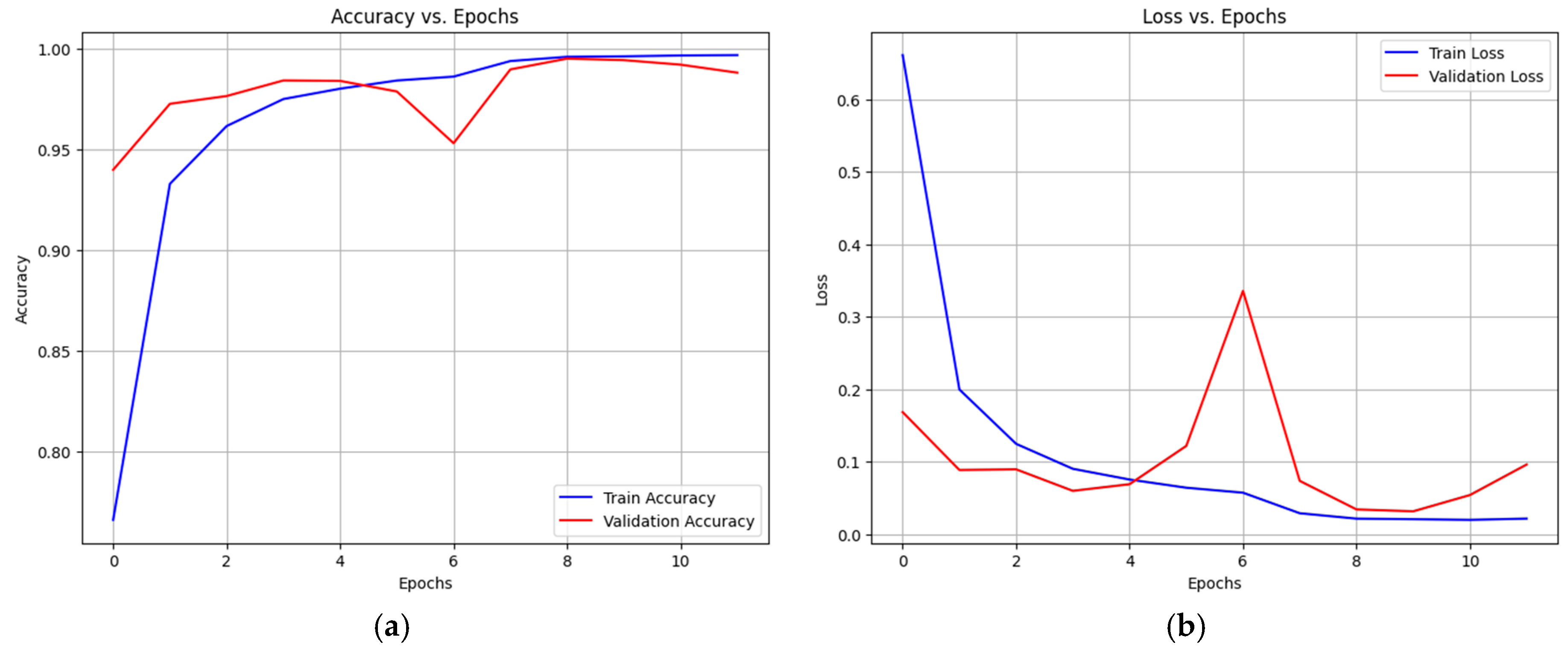 Figure 9, the training process was conducted for 12 epochs, covering both accuracy and loss for the training and validation datasets. In the early stage (Epoch 1), the training accuracy was relatively low, indicating that the model was still in the initial phase of feature learning. The accuracy increased significantly between Epochs 2 and 4, exceeding 97%, which demonstrates the model’s ability to effectively learn patterns from the dataset. The difference between training and validation accuracy remained small, indicating that no significant overfitting occurred. The training loss consistently decreased from 1.1395 in the first epoch to 0.0246 in the final epoch.