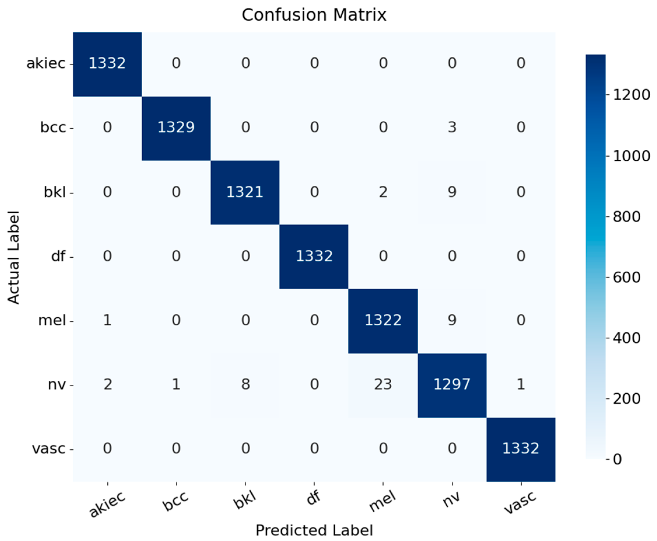 Figure 10, the global Xception-based CNN model demonstrates very high classification performance, with the majority of predictions located along the main diagonal. Several classes, including AKIEC, DF, and VASC, are classified perfectly without any misclassifications. The number of misclassifications is very small and mainly occurs in the NV, MEL, and BKL classes. This indicates the presence of visual similarities among these skin lesion classes, which makes the classification task more challenging. Nevertheless, the number of errors is not significant and does not affect the overall performance of the model. Overall, the confusion matrix indicates that the model has good generalization capability for skin disease classification.