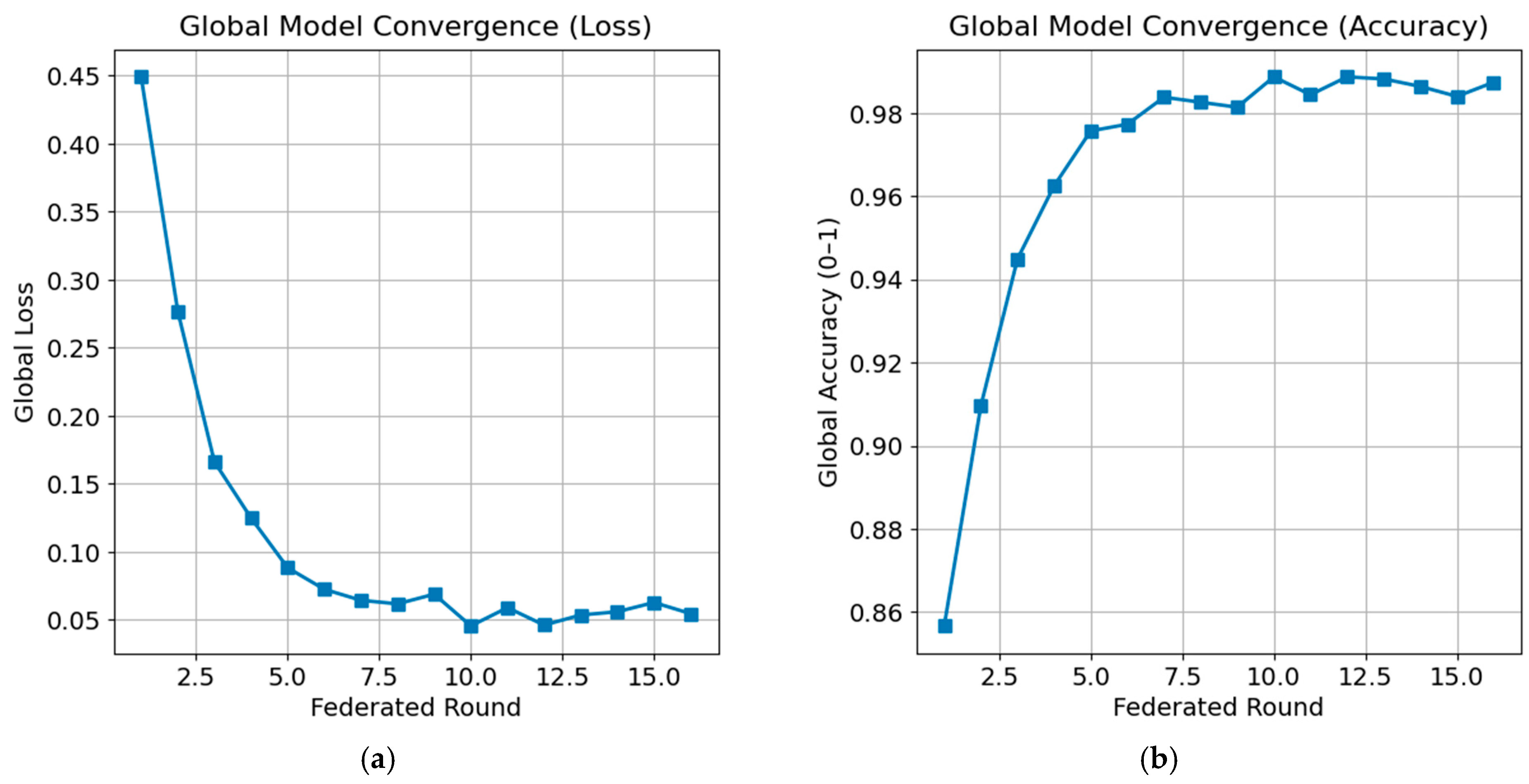 Figure 11a, the global loss exhibits a significant decrease during the early rounds of Federated Learning. The initial loss value of 0.4491 in the first round decreases sharply within the first five rounds, indicating that the global model is able to rapidly learn meaningful feature representations from the aggregated local model updates. Afterward, the loss continues to decrease gradually and stabilizes at values below 0.06, with minor fluctuations in subsequent rounds. Such fluctuations are common in Federated Learning and are generally caused by differences in local data distributions (non-IID) as well as variations in model updates from individual clients.