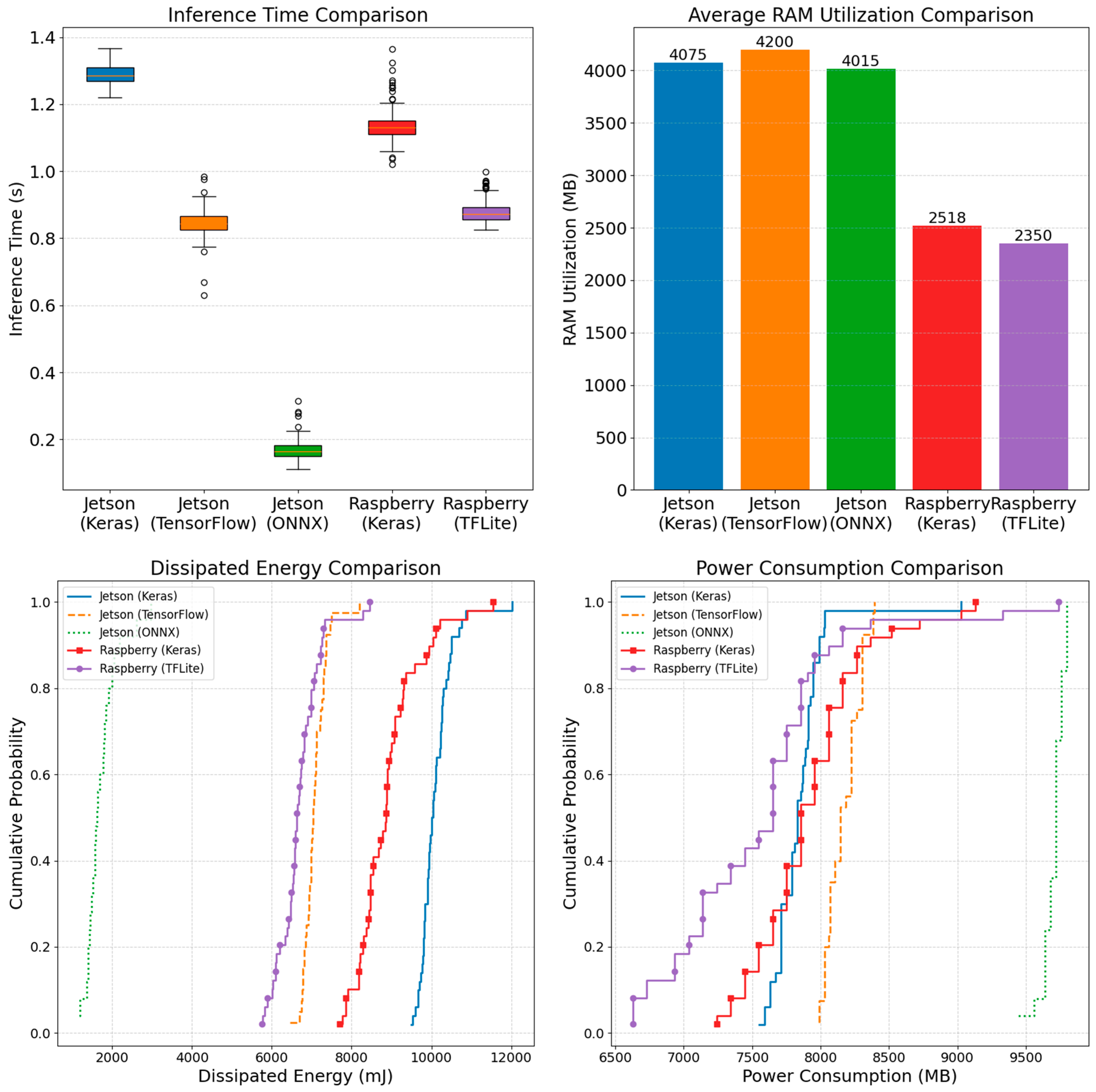 Figure 12 provides a comprehensive evaluation of inference performance on the edge computing devices—Jetson Orin Nano and Raspberry Pi 5—by considering several key metrics, including inference time, RAM utilization, power consumption, and dissipated energy. The inference time comparison shows that the ONNX model on Jetson Orin Nano achieves the fastest inference among all configurations. This observation is consistent with the results presented in