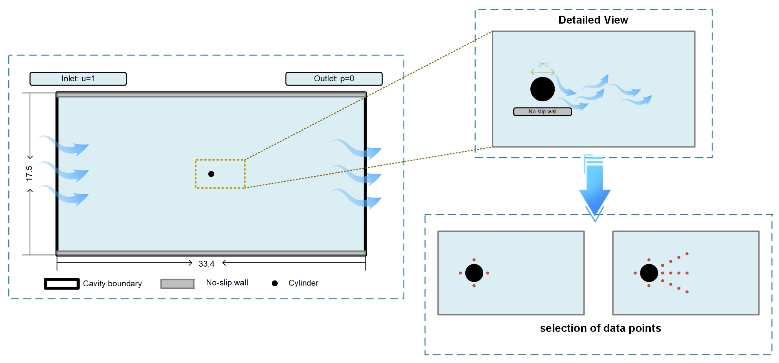 Figure 3. To clearly illustrate the flow field structure, a rectangular region near the cylinder is highlighted for detailed analysis. The cylinder is positioned at the center of a square computational domain. After non-dimensionalization, the cylinder diameter is set to 1, and the dimensions of the computational domain are 33.4 in length and 17.5 in width. The flow boundary conditions are set as follows: the left side is a uniform inflow inlet with a velocity of 1; the static pressure at the right-side outlet is set to 0; all other walls and the cylinder surface employ a no-slip boundary condition. The specific boundary condition settings are: