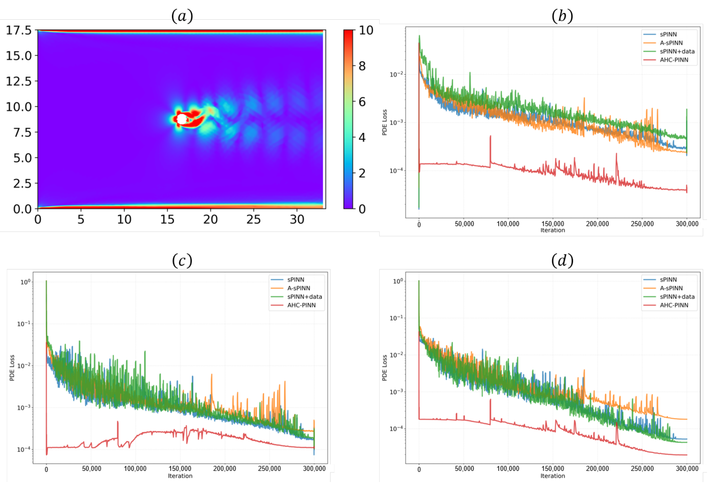 Figure 5a, it is evident that the errors are primarily concentrated in regions with high velocity gradients behind the cylinder. This suggests that the predictive accuracy of PINNs for solving this PDE is largely constrained by the physical variations in high-gradient regions. With the A-sPINN method, the prediction results in the wake region show clear improvement compared to sPINN, and a distinct periodic flow structure becomes observable. This trend is further enhanced after incorporating the hard-constraint strategy (AHC-PINN). Furthermore, observing the PDE loss decay curve in