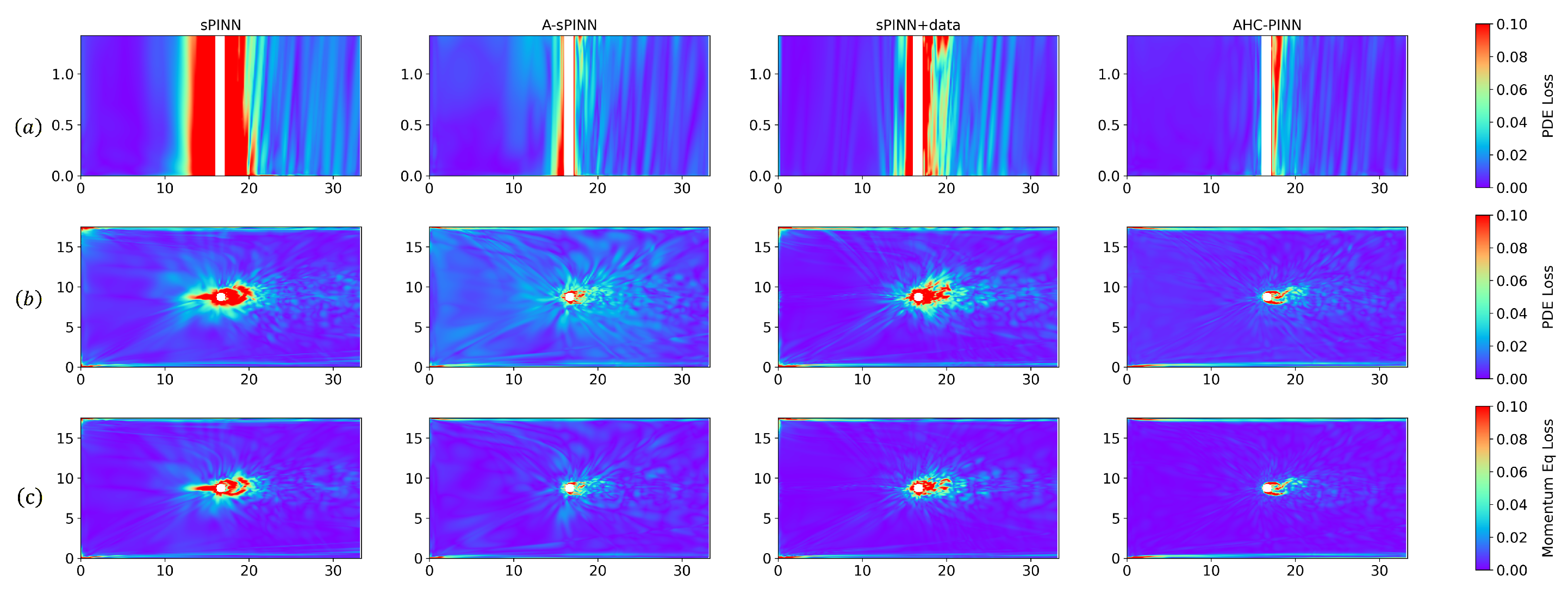 Figure 6c corroborates this view: the loss is predominantly concentrated in this high-gradient region. The substantially reduced momentum equation loss for the A-sPINN method effectively demonstrates the positive impact of the loss-driven sampling strategy for PINNs when dealing with large-gradient regions, while the AHC-PINN method further reduces the overall equation loss across the entire domain. Although introducing supervised data (sPINN+data) can improve prediction accuracy, as observed in