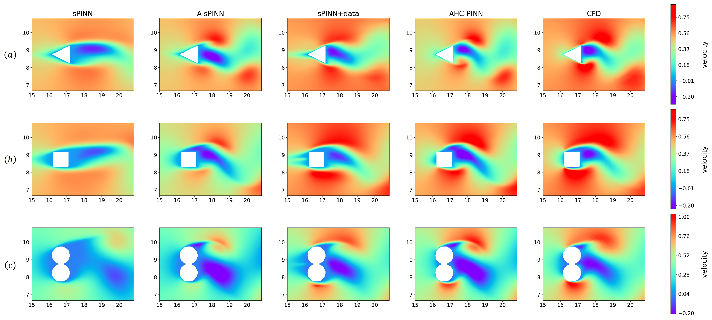 To validate the generalization capability of the AHC-PINN method, this section tests the flow field prediction performance of four approaches—sPINN, A-sPINN, sPINN+data, and AHC-PINN—under the presence of obstacle structures with different shapes, as configured in
