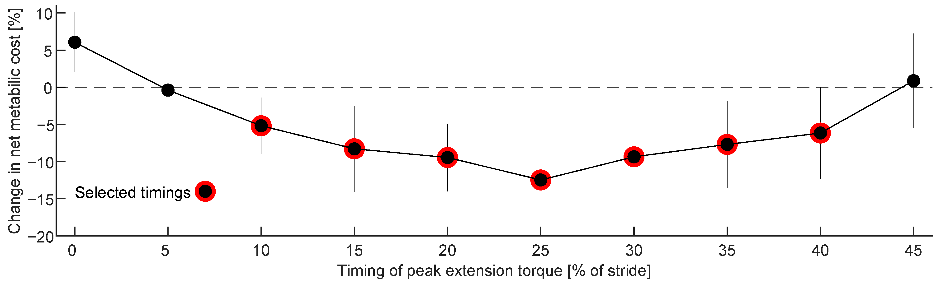 Figure 1), we selected conditions with peak extension torque timings between 10% and 40% as these seven individual samples presumed to reduce muscle activity. These conditions showed the greatest reductions in metabolic cost and were evenly distributed around the maximum metabolic cost reduction of −12.5 ± 4.7%, which occurred with a peak extension torque timing of 25% and a peak flexion torque timing of 75%.