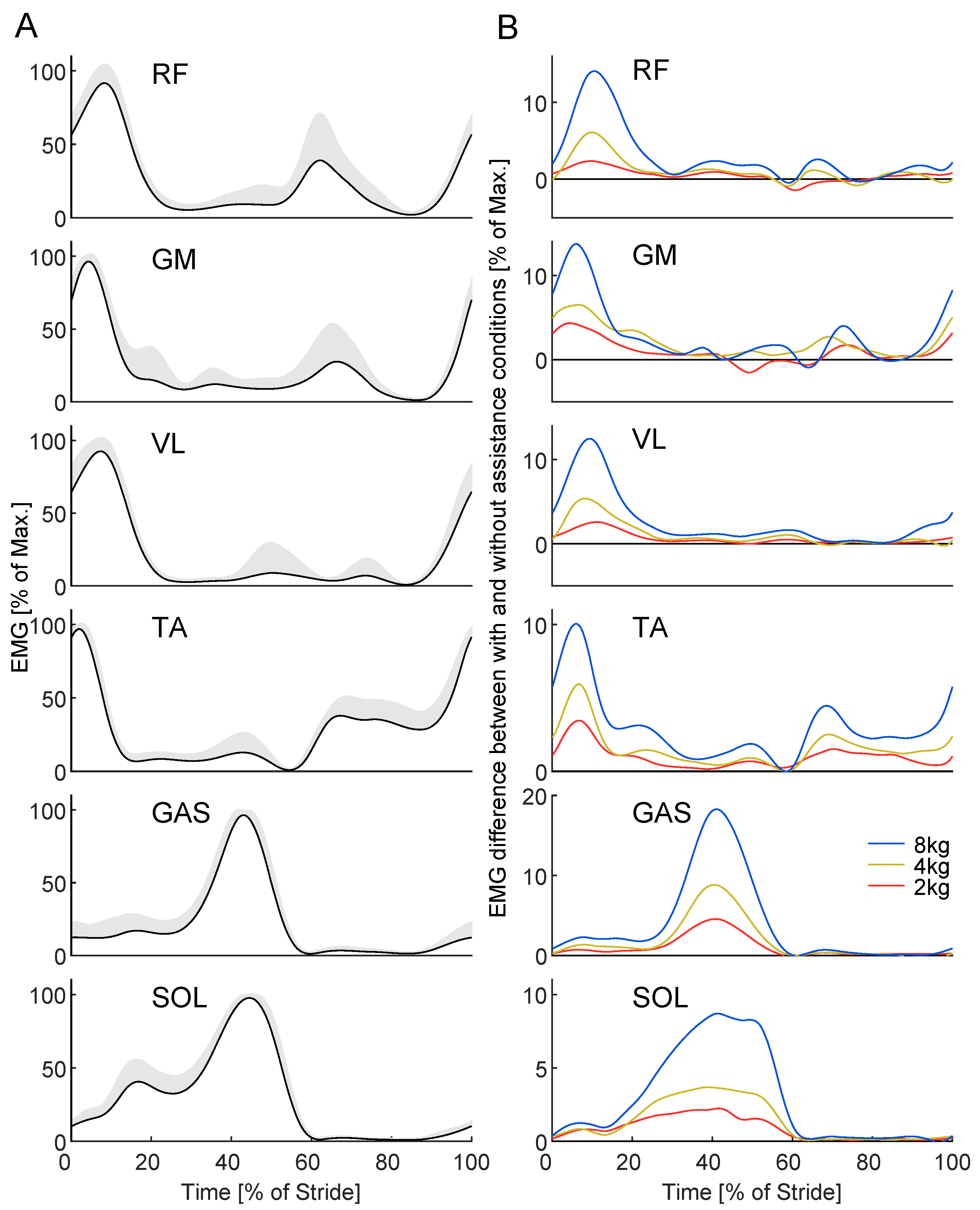 35]. These load-induced changes affect not only whole-body metabolic cost but also the activation of individual lower-limb muscles, which can be observed in corresponding EMG signals [