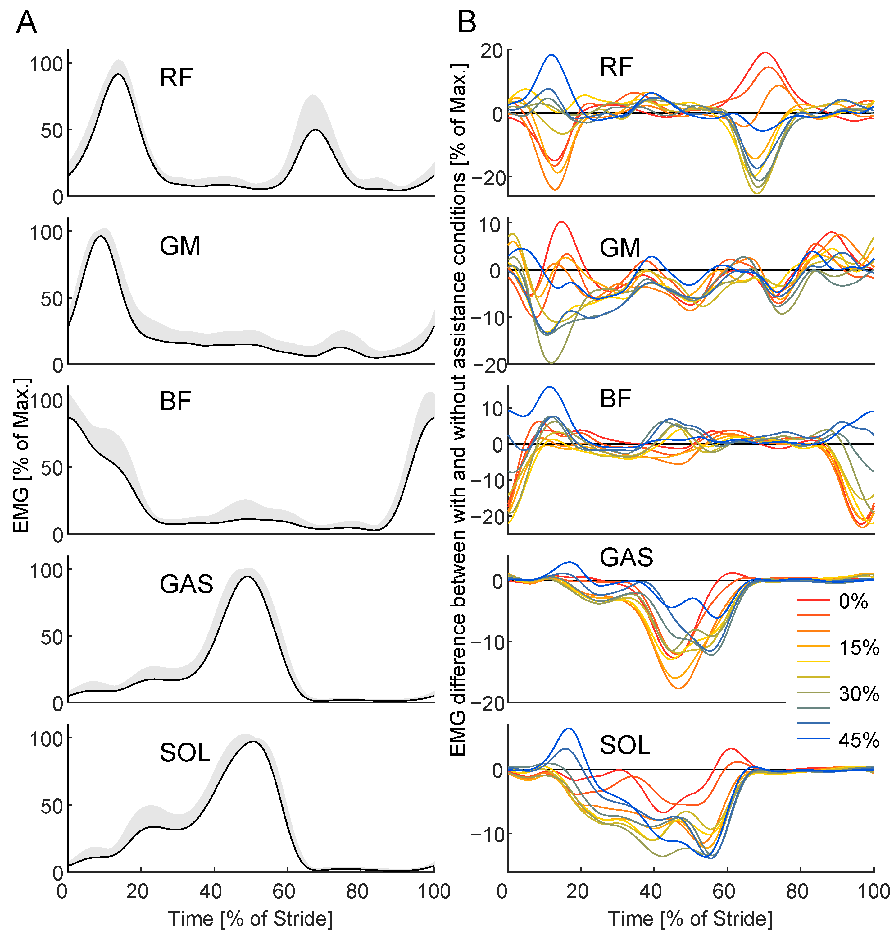 Figure 2). In contrast, in the Exo experiment, the normalized EMG primarily decreased for the GAS and SOL, whereas both increases and decreases were seen for the RF, GM, and BF depending on the peak extension torque timing (