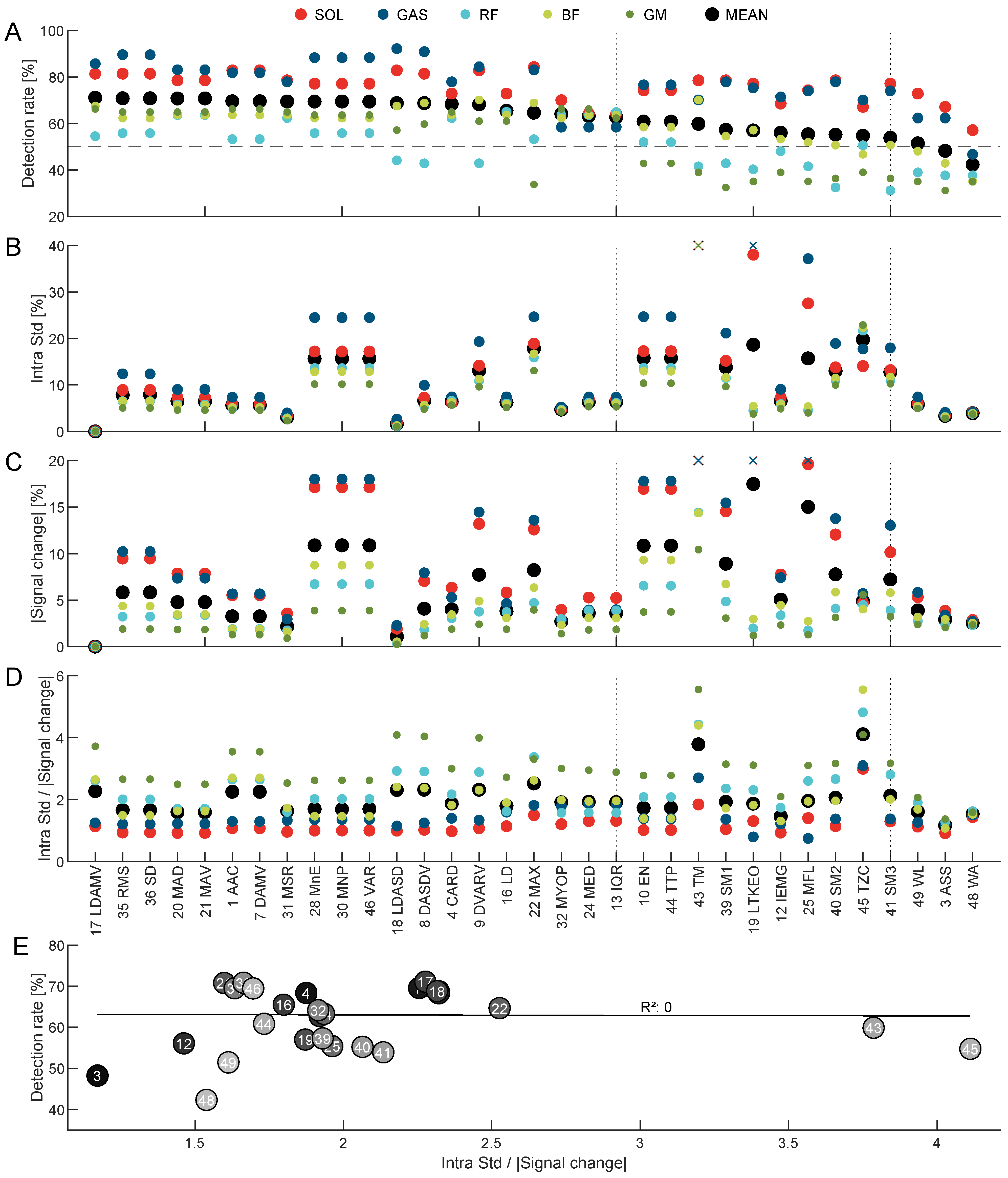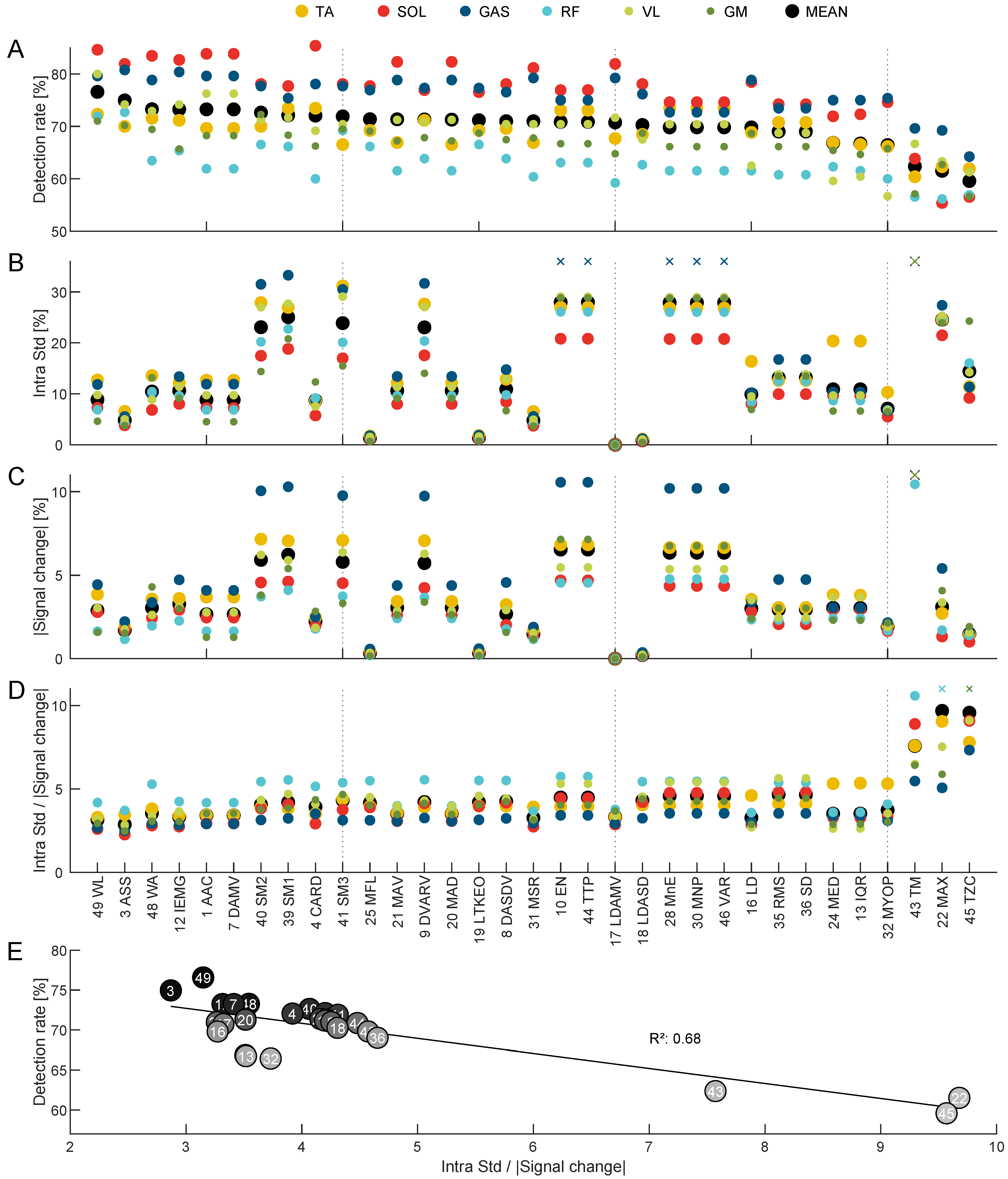 The absolute value of the feature signal-change was used to determine the intra-participant standard deviation to absolute signal-change ratio. This approach was chosen because individual strides, muscles and participants could all induce both positive and negative signal-change values, potentially resulting in a near-zero average signal-change and thus extreme ratio values. Since the amplitude of change was our primary criterion, using the absolute value was deemed appropriate.