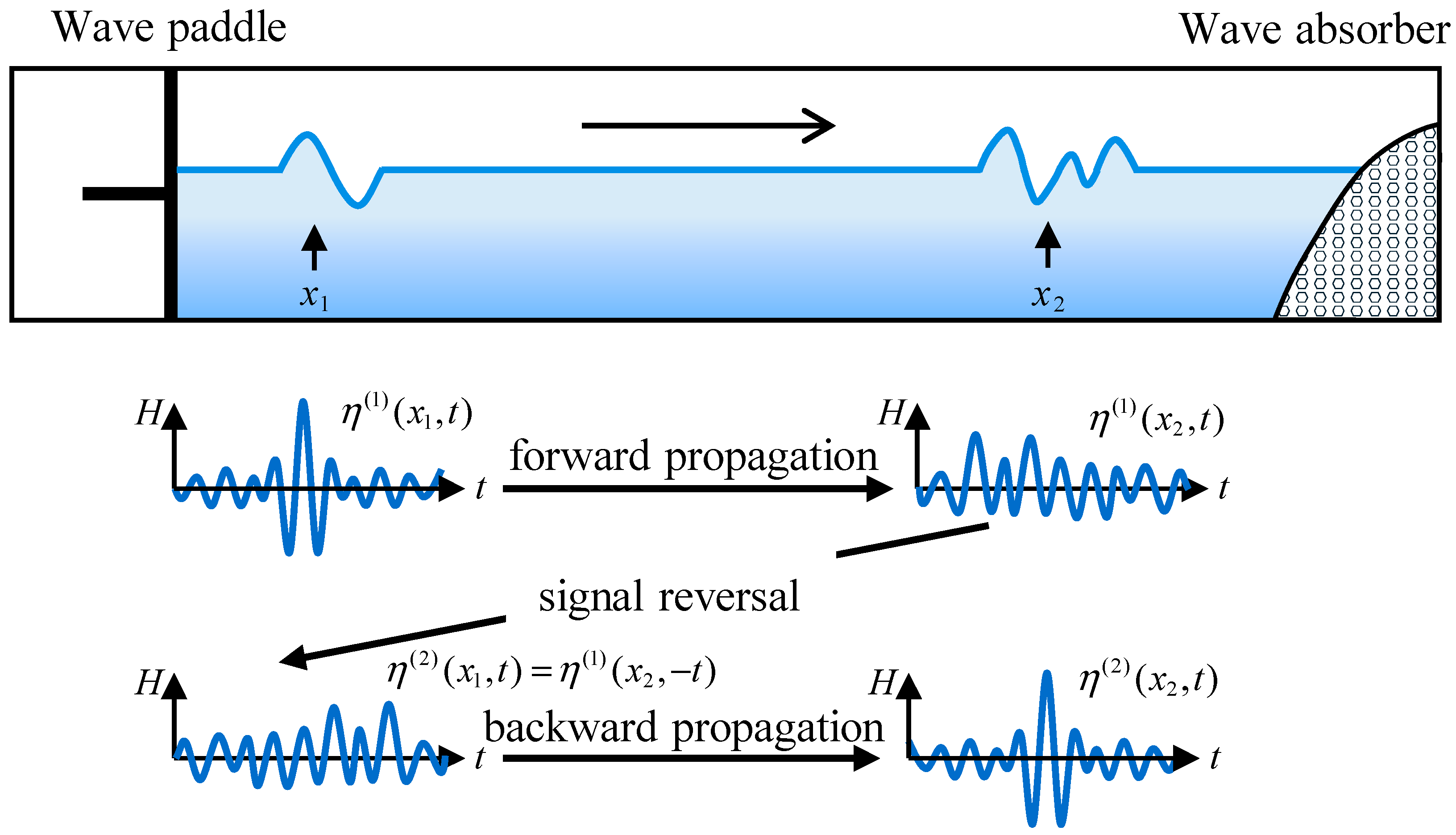 - Ducrozet, G.; Bonnefoy, F.; Mori, N.; Fink, M.; Chabchoub, A. Experimental reconstruction of extreme sea waves by time reversal principle. J. Fluid Mech. 2020, 884, A20. [Google Scholar] [CrossRef]