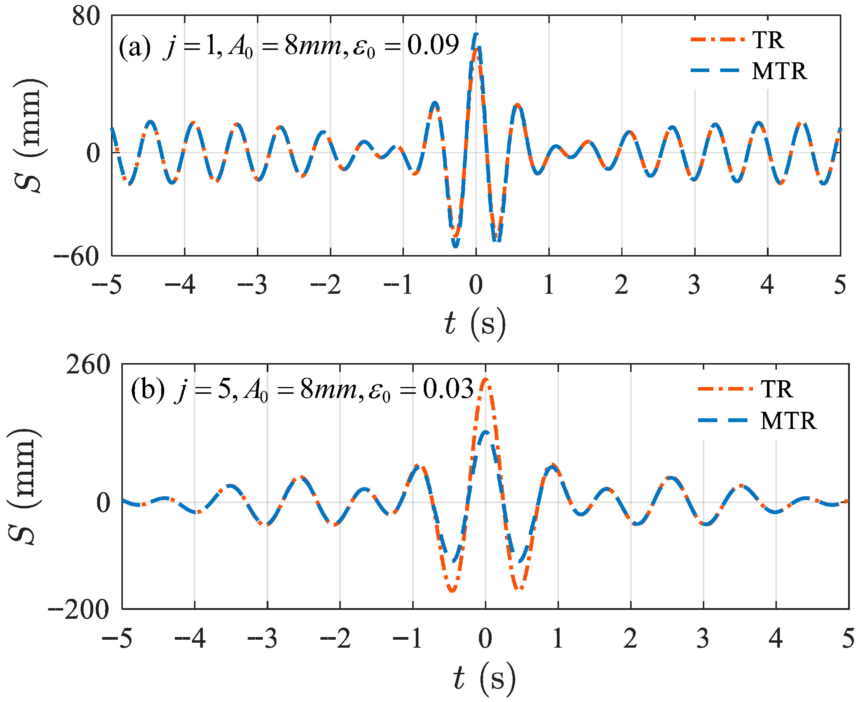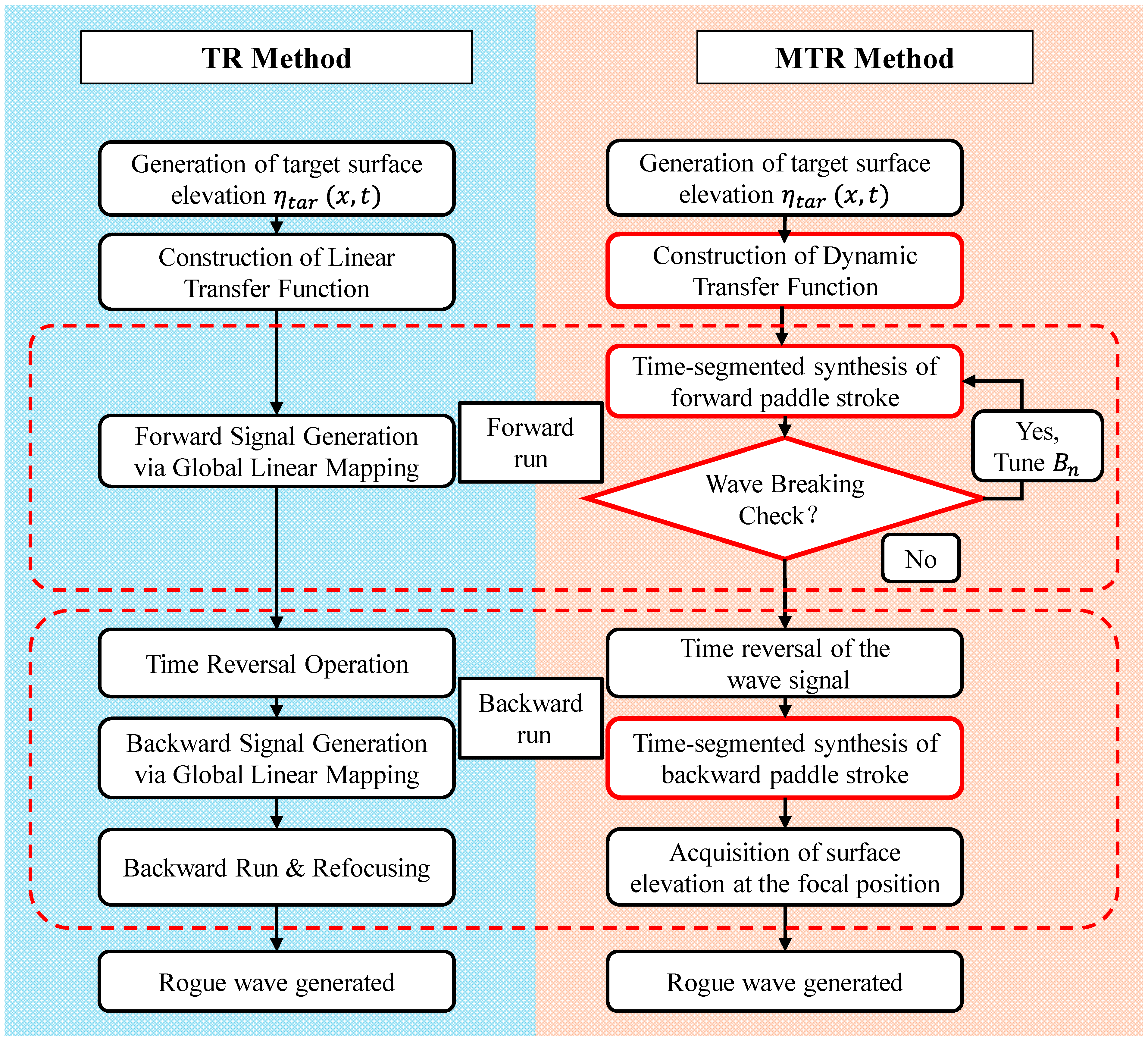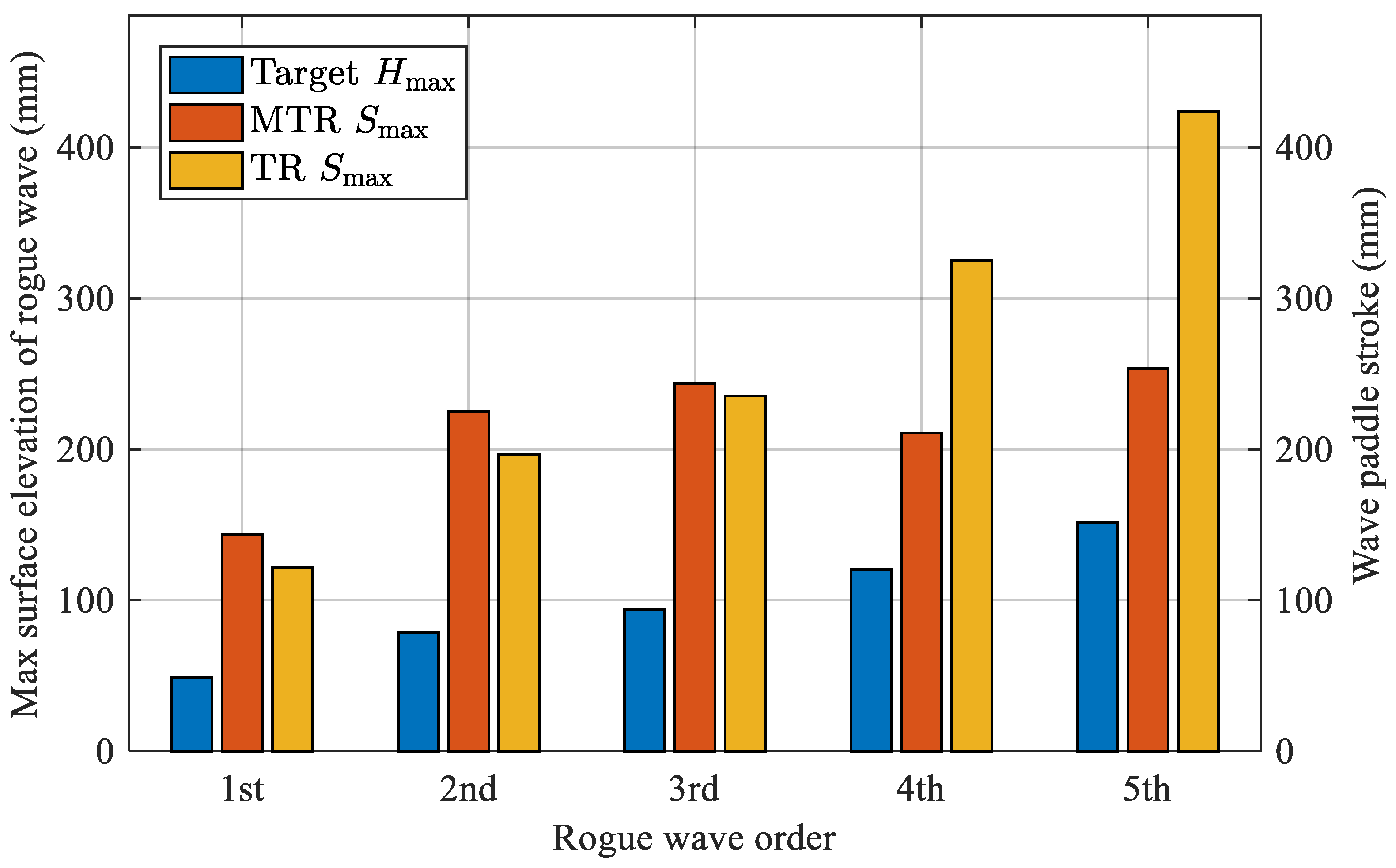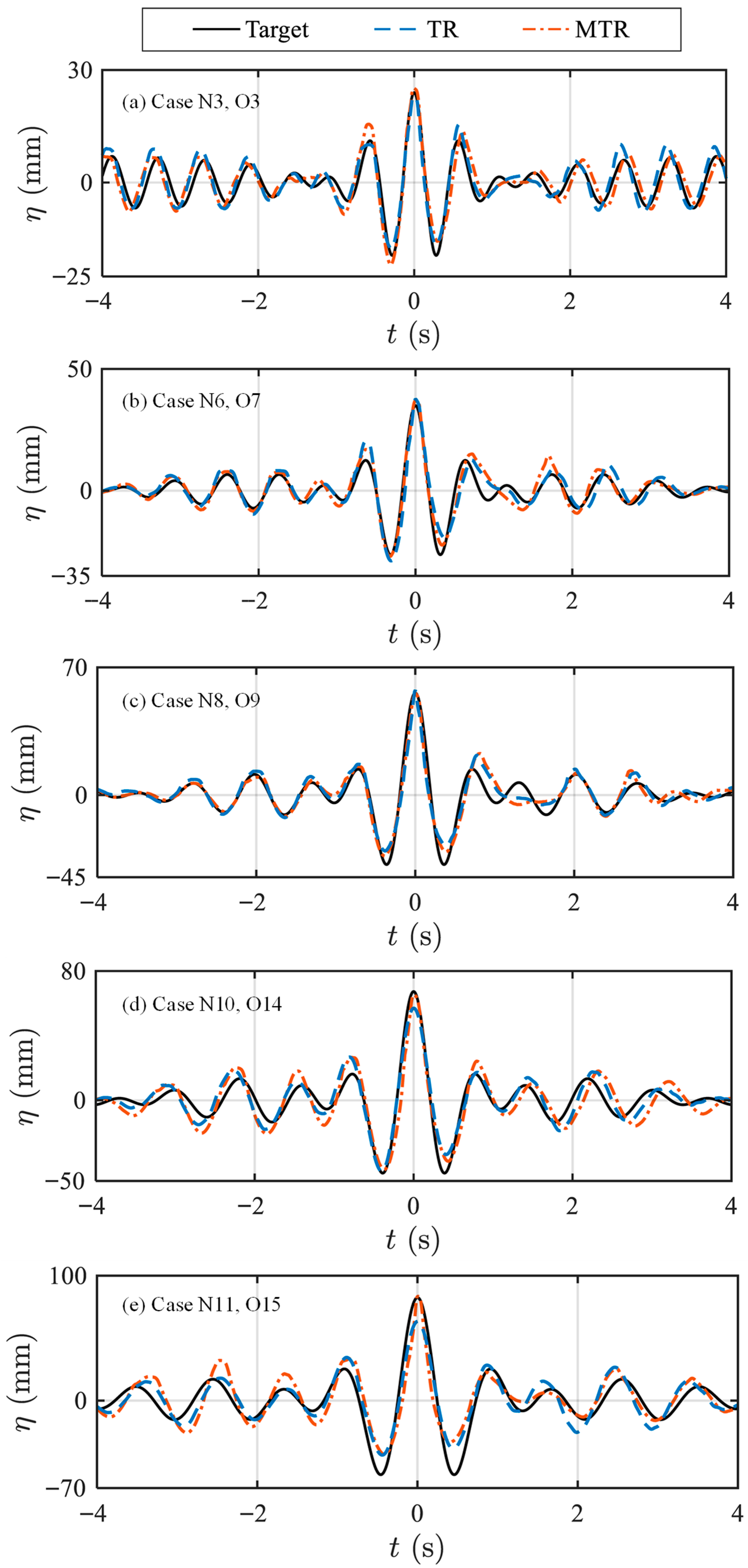 - The dynamic transfer function-based MTR method greatly enhances the focusing and reconstruction of higher-order rogue waves. Experimental results show that for the third- to fifth-order cases, the wave profiles align very well with the analytical solutions. Notably, the maximum wave height at focus is much closer to the theoretical prediction, and the central peak (main crest) is accurately reproduced with high fidelity, preserving its sharp and full structure. Compared to the TR method, MTR needs a smaller maximum paddle stroke to produce the same wave target, and its prescribed motion transitions more smoothly across the rogue wave segment, effectively preventing wave breaking caused by excessive stroke demands.