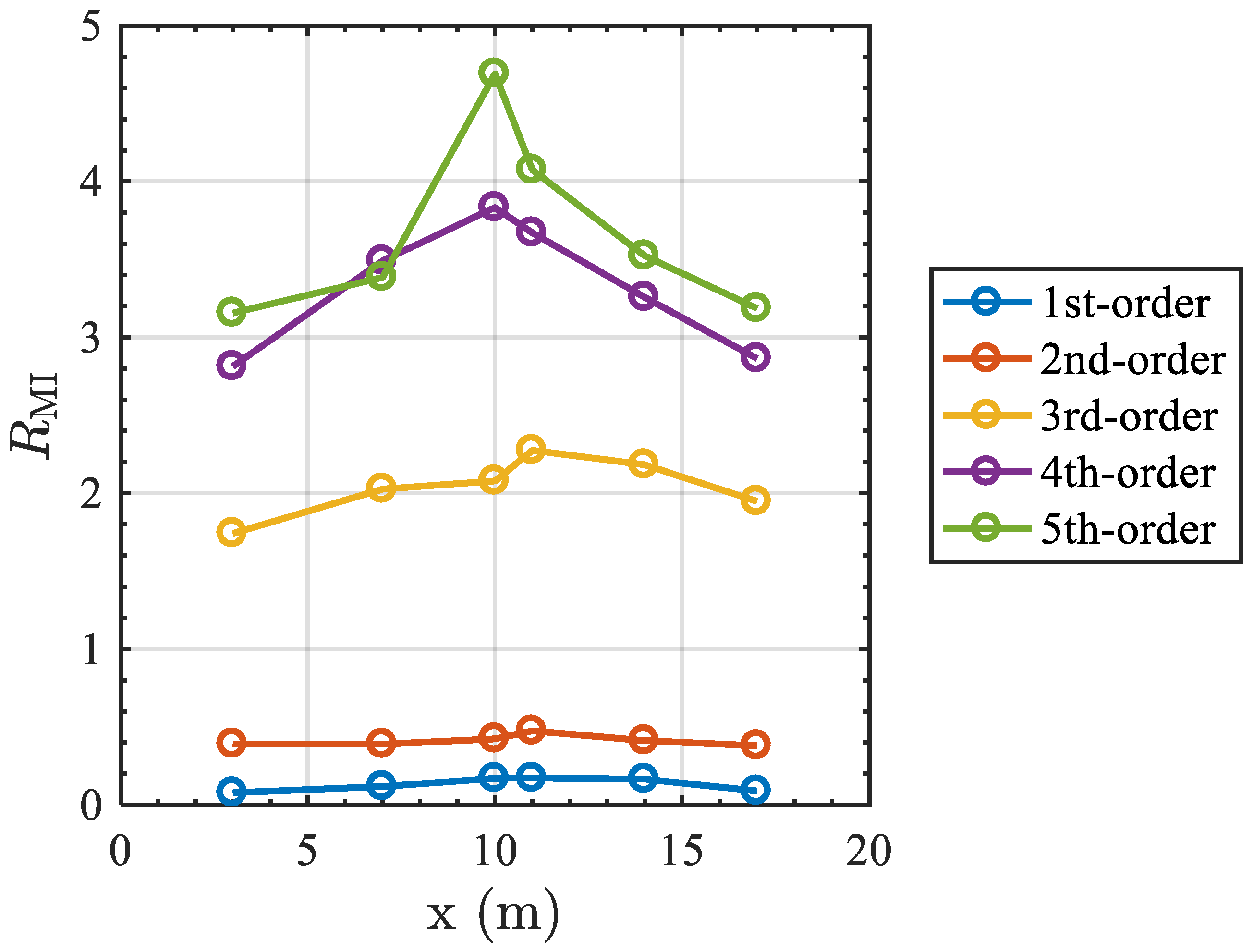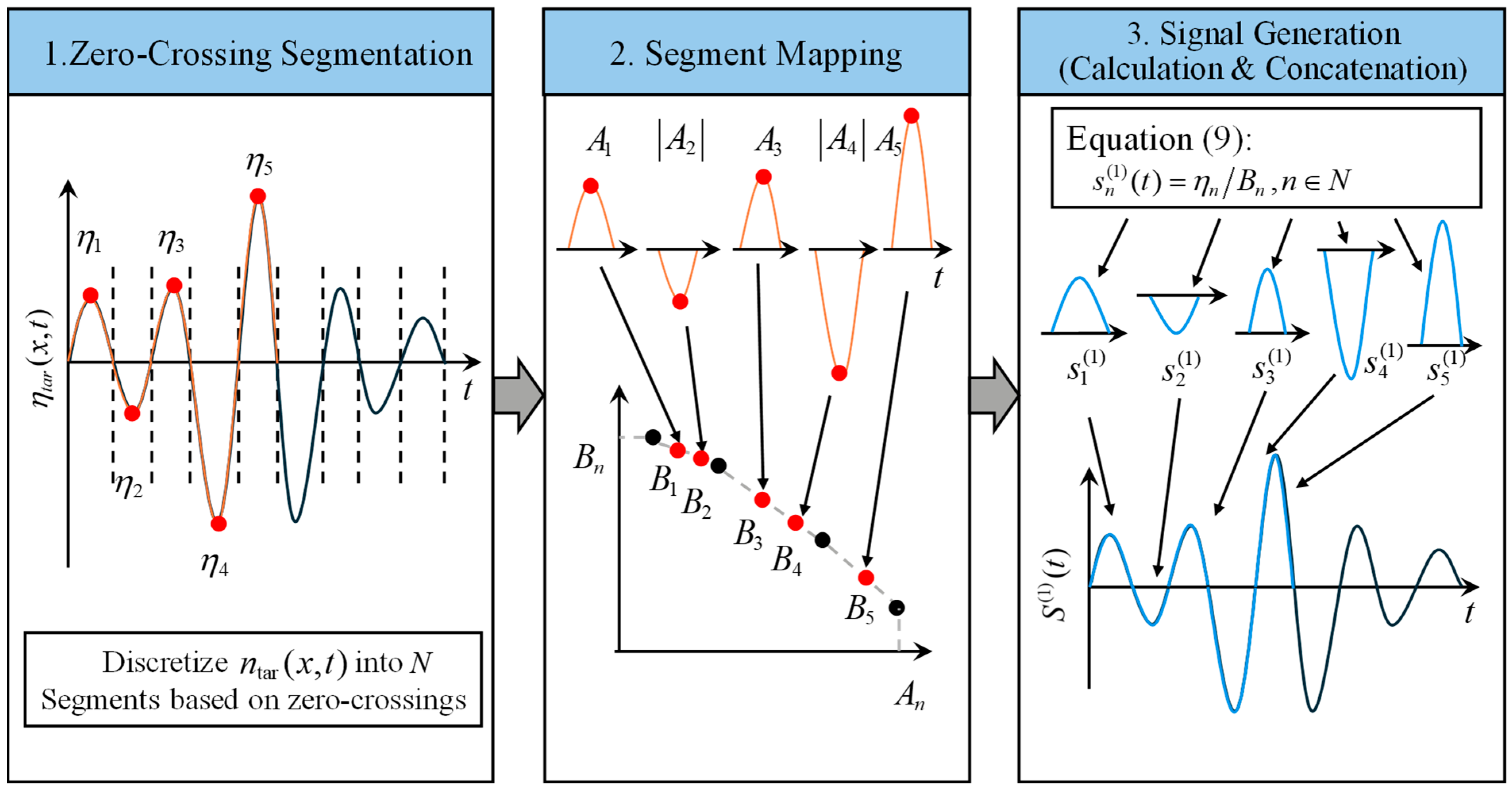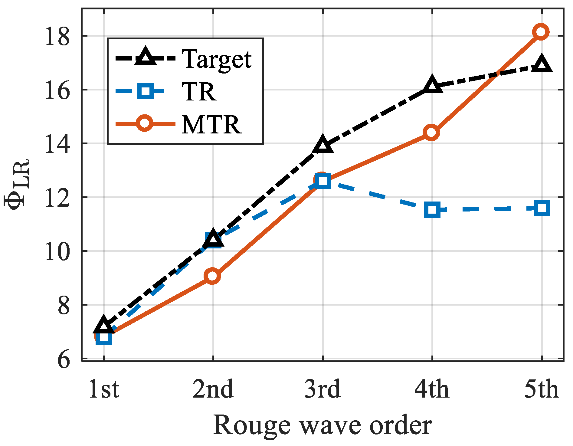 - Spectral analysis shows that the MTR method effectively generates clear peaks at the carrier frequency’s integer multiples. This demonstrates its enhanced capacity to reproduce the bound higher harmonics associated with Stokes-like nonlinearity, which is essential for analyzing high-steepness waves. By accurately maintaining these phase-locked harmonics, the MTR method enables precise reconstruction of sharp crest shapes.