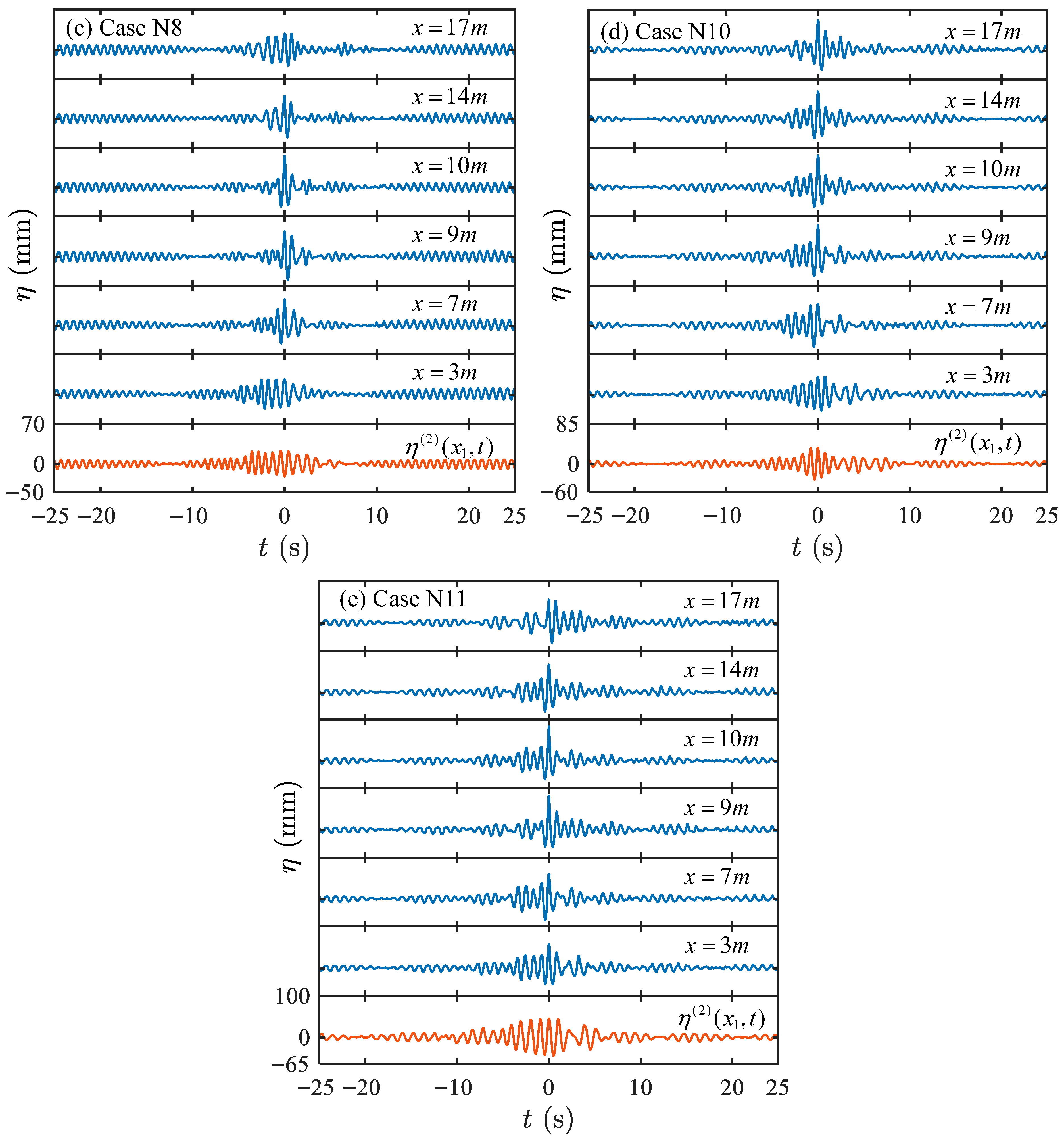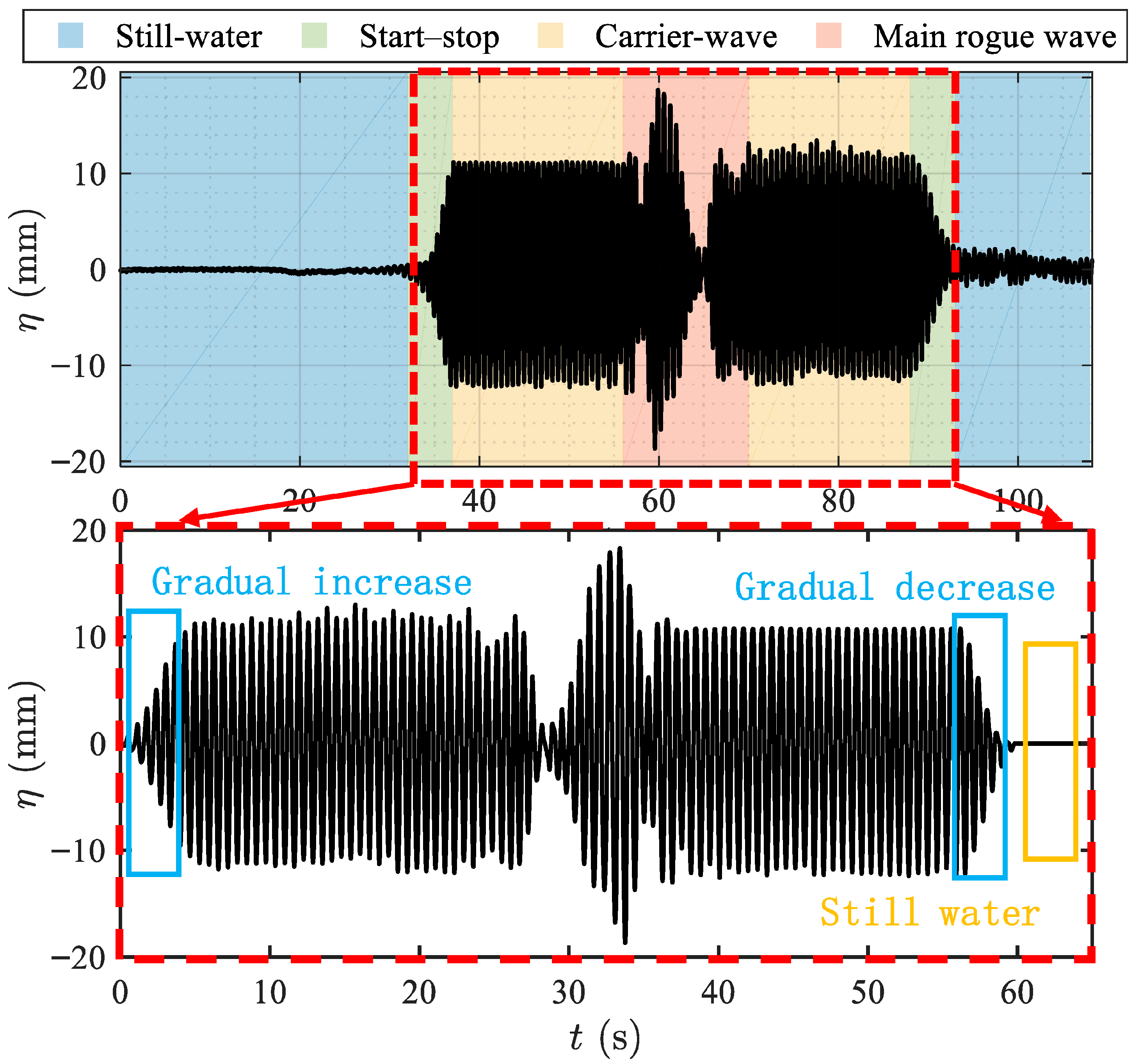 - Compared to earlier fifth-order rogue waves with a wave steepness of around 0.01, this study successfully produces a fifth-order rogue wave with a steepness of 0.03 using the modified TR method under similar water depth and focusing conditions. This marks nearly a threefold increase in steepness. Furthermore, the ratio of the rogue wave amplitude to the carrier wave’s amplitude increased from 8.4 to 10.6, making it the fifth-order rogue wave with the highest wave steepness and focusing amplification reported to date.