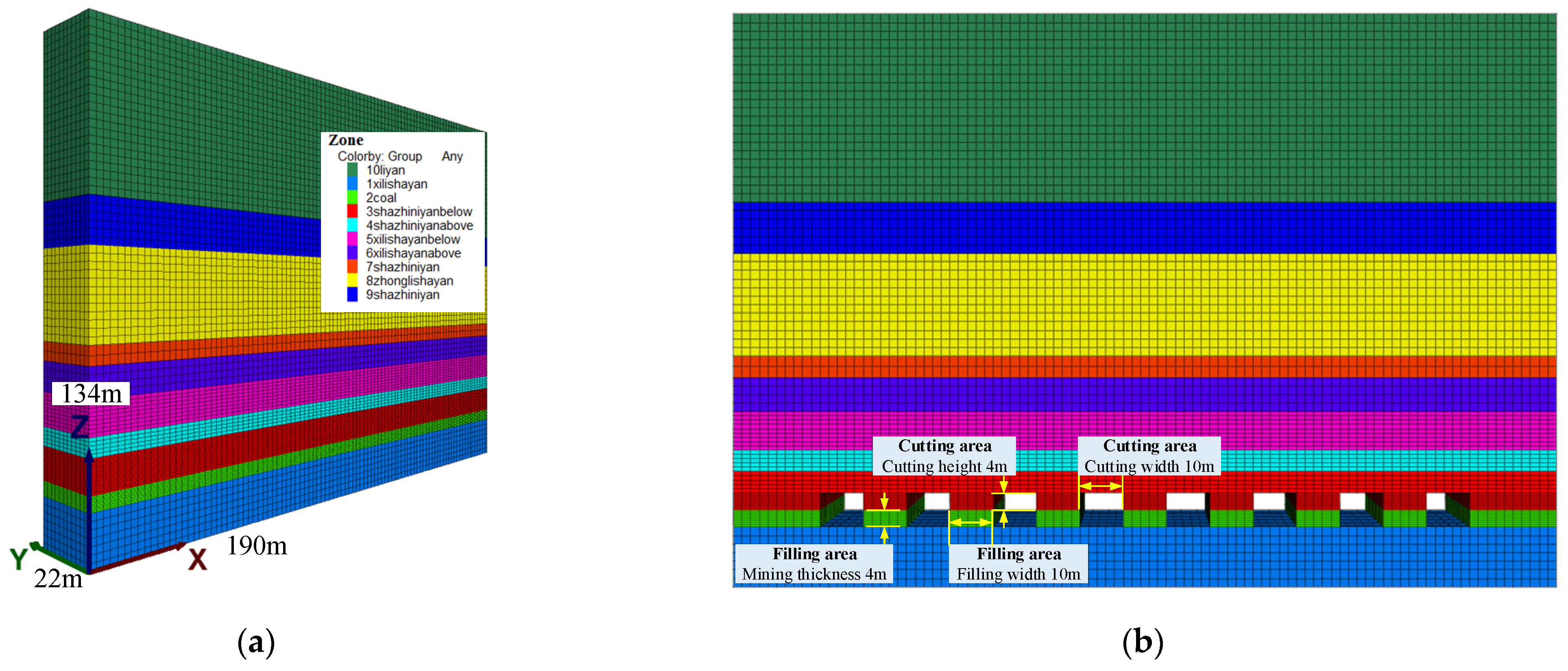 - To control surface subsidence, improve the filling effect, and take into account the difficulty of roof cutting operation, the author proposes the 10-10-X group as the recommended scheme. If the surface subsidence control requirements are relatively high, the 5-10-X group can be considered to increase the cutting height and reduce the cutting width. In the 10-5-X group, the roof displacement is the largest, and the filling area stress is small. This is the most unfavorable situation, which should be avoided in practical production.