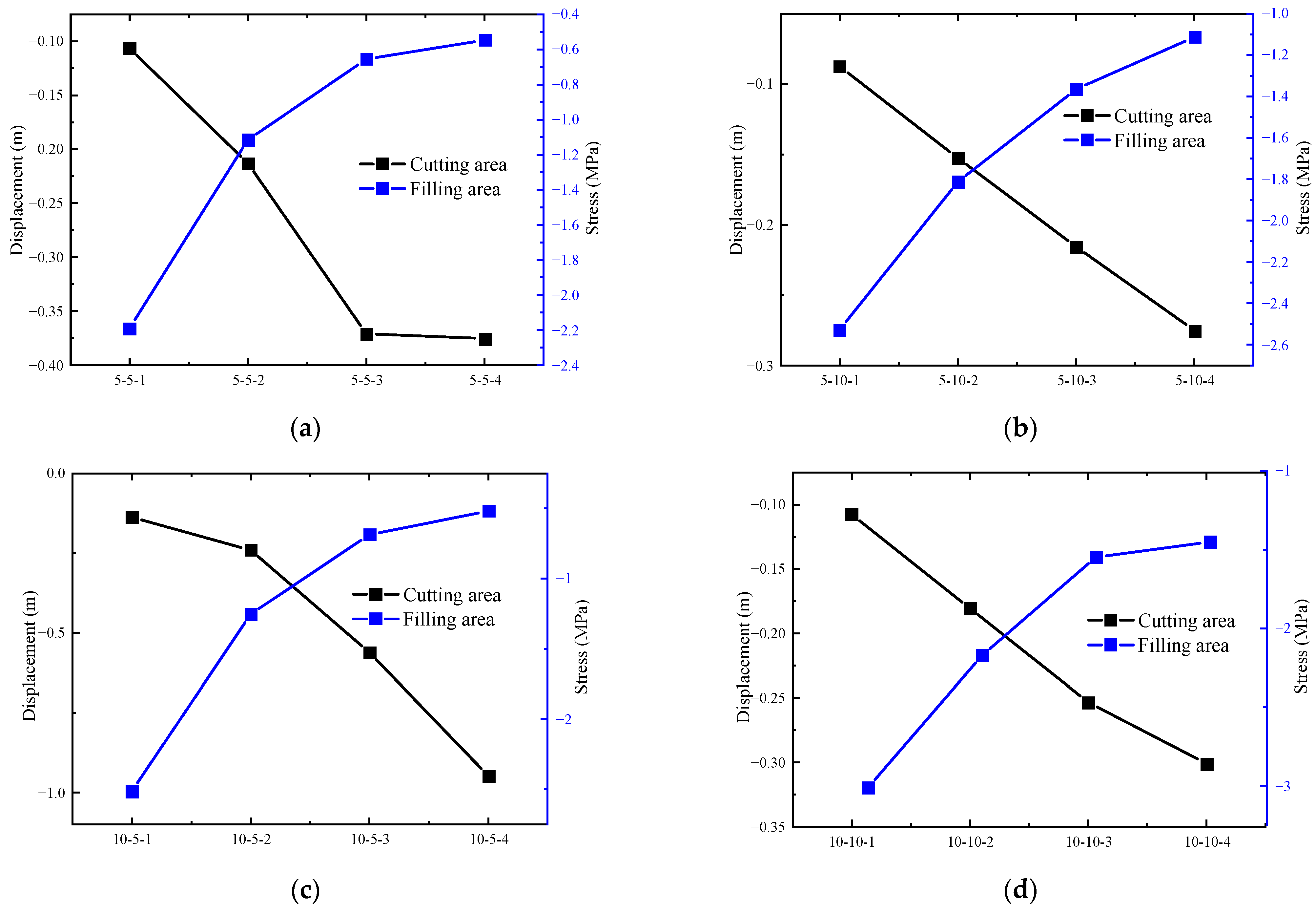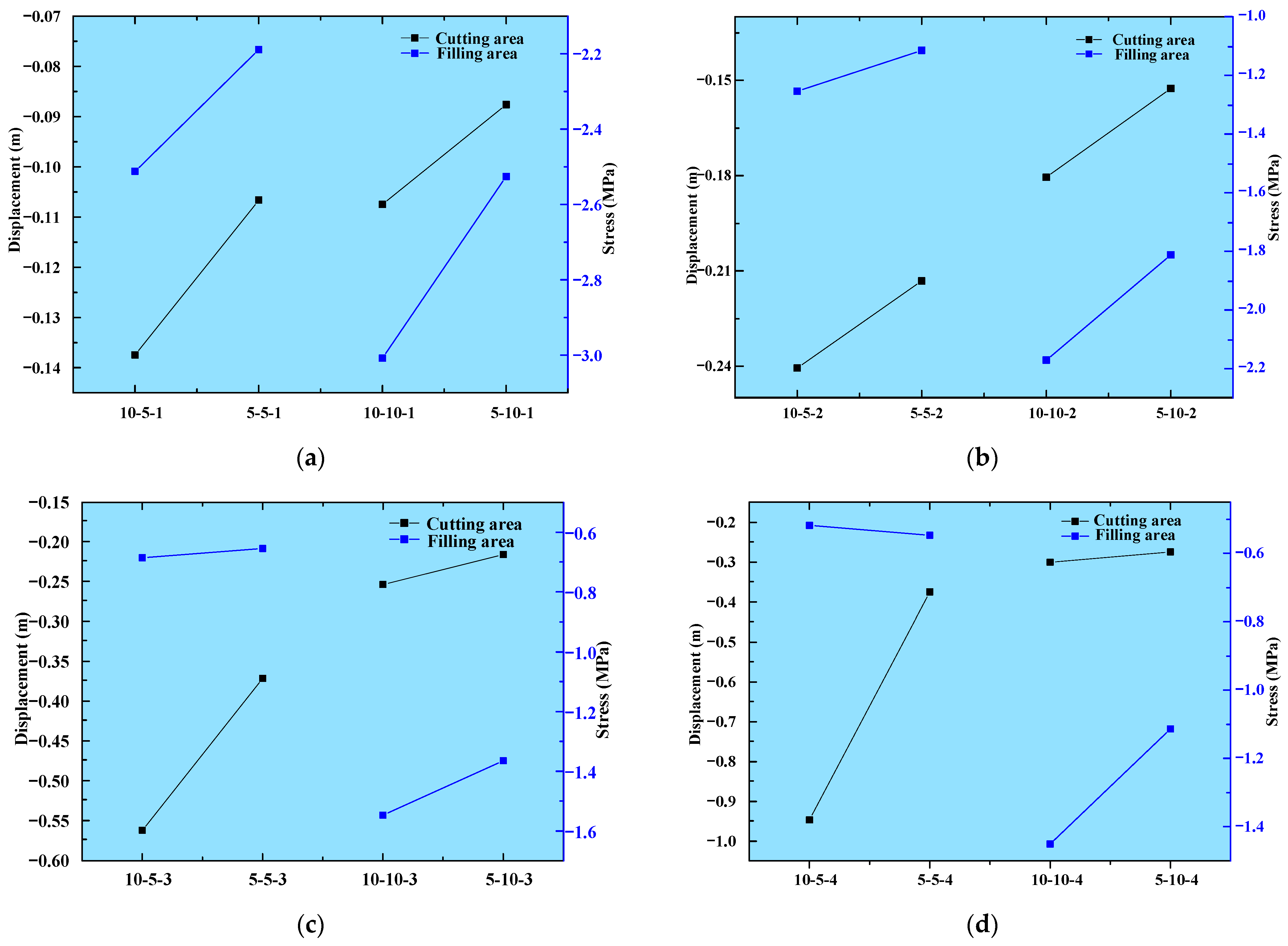 | Simulation Grouping | Cutting Area Displacement/m | Filling Area Stress/MPa | Simulation Grouping | Cutting Area Displacement/m | Filling Area Stress/MPa |