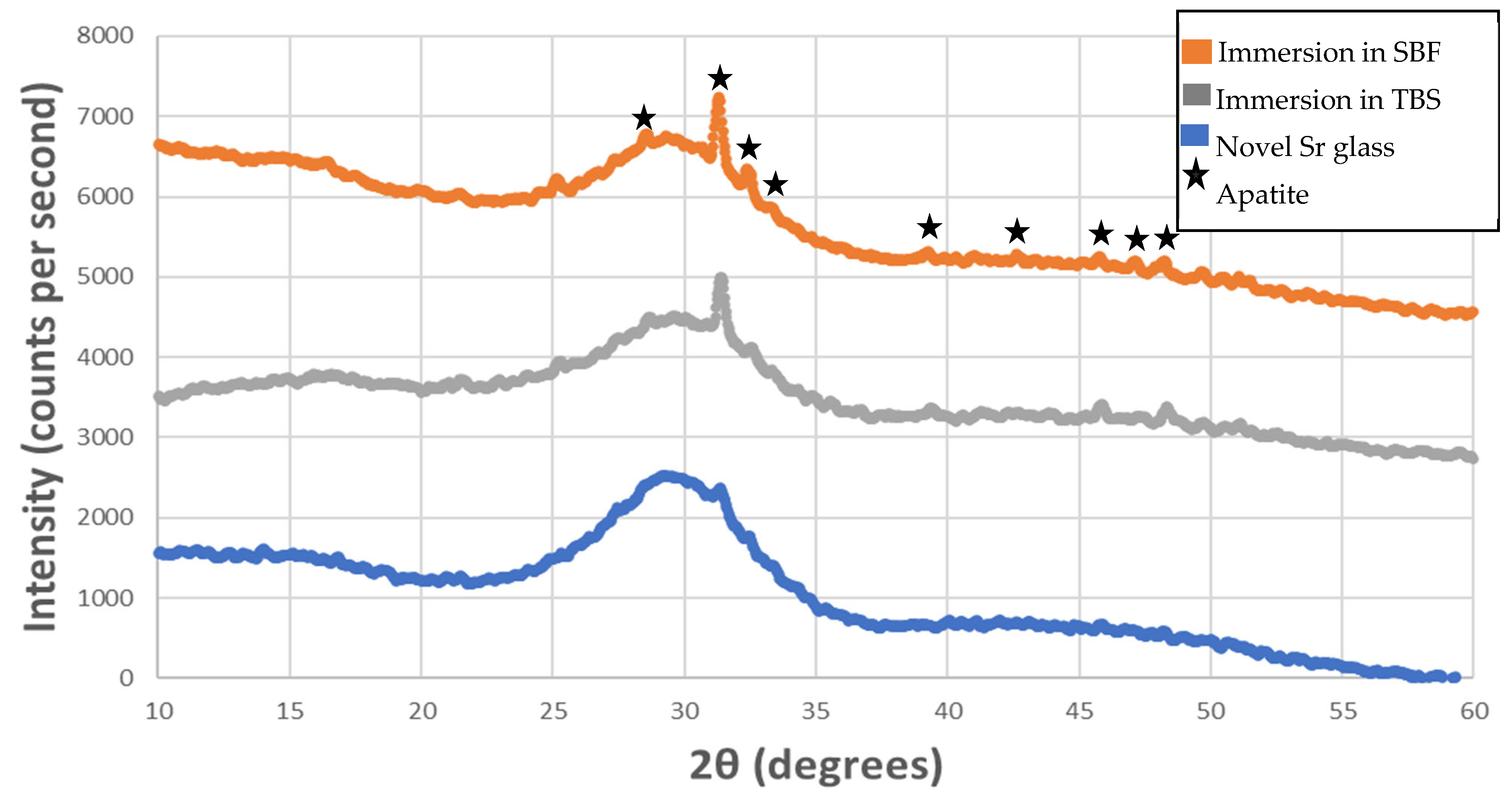 An initial pilot study was performed to test the bioactivity of the novel strontium-based bioactive glass and ensure its ability to form apatite prior to further testing. The bioactive glass (0.075 g) was immersed in 50 mL of simulated body fluid (SBF) or tris buffer solution (TBS) at pH 7.4 for a period of 7 days. X-ray diffraction (XRD) patterns were then assessed to identify apatite formation. XRD analysis was carried out for the glass powder and the immersed samples (size <45 μm) using a Panalytical X’PERT PRO X-ray diffractometer (Malvern Panalytical, Almelo, The Netherlands), using Bragg–Brentano flat plate geometry and Cu Kα radiation (λ1 = 1.54059 Å and λ2 = 1.54442 Å). Powder samples were packed into stainless steel holders. Patterns were collected from 5 to 70° 2θ with an interval of 0.0334° and a step time of 200 s. XRD data were analysed using X’Pert Data Collector (v2.2, Panalytical, Almelo, The Netherlands). The XRD pattern obtained showed clear evidence of apatite formation after 7 days of immersion for both SBF and TBS (