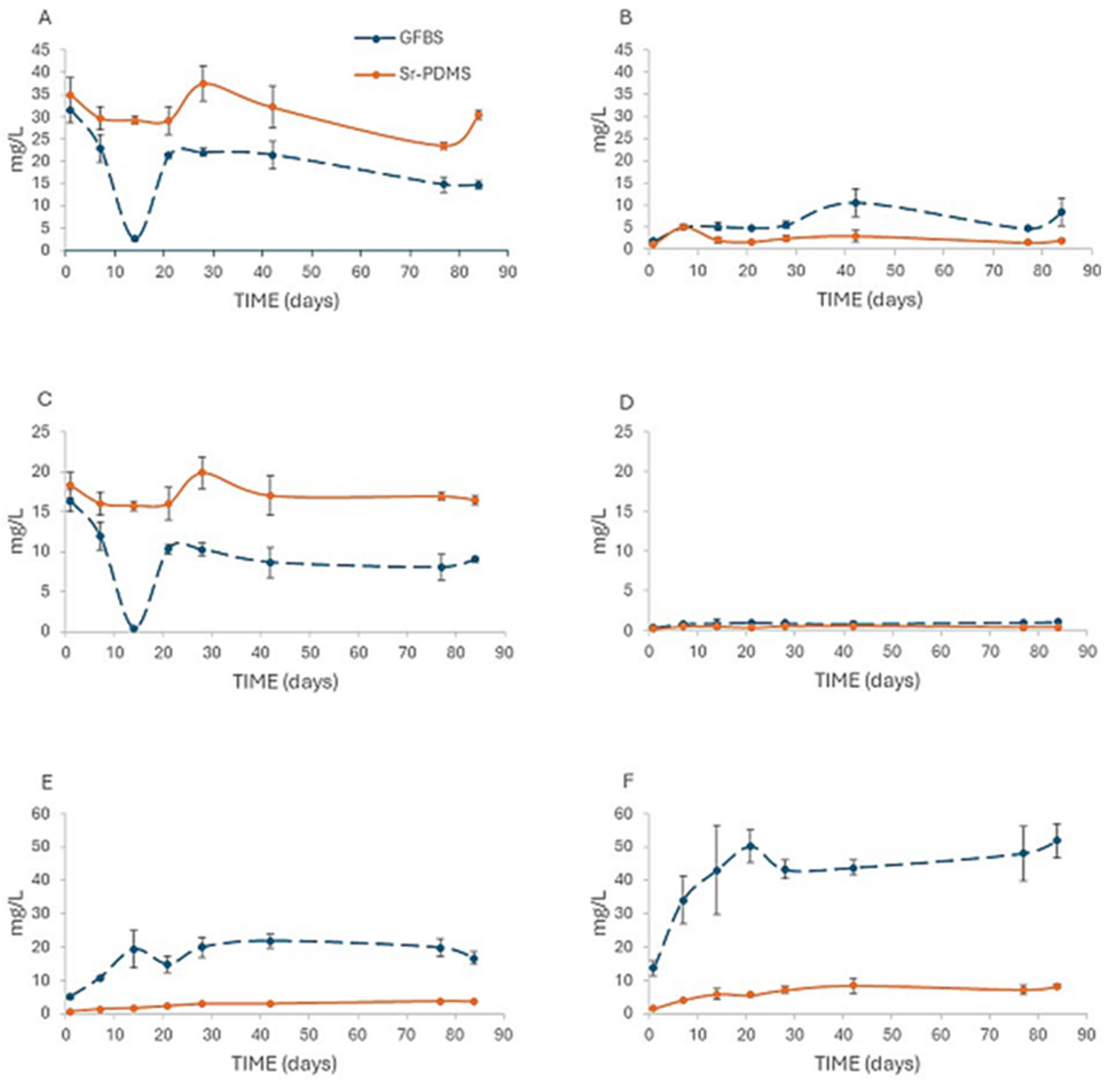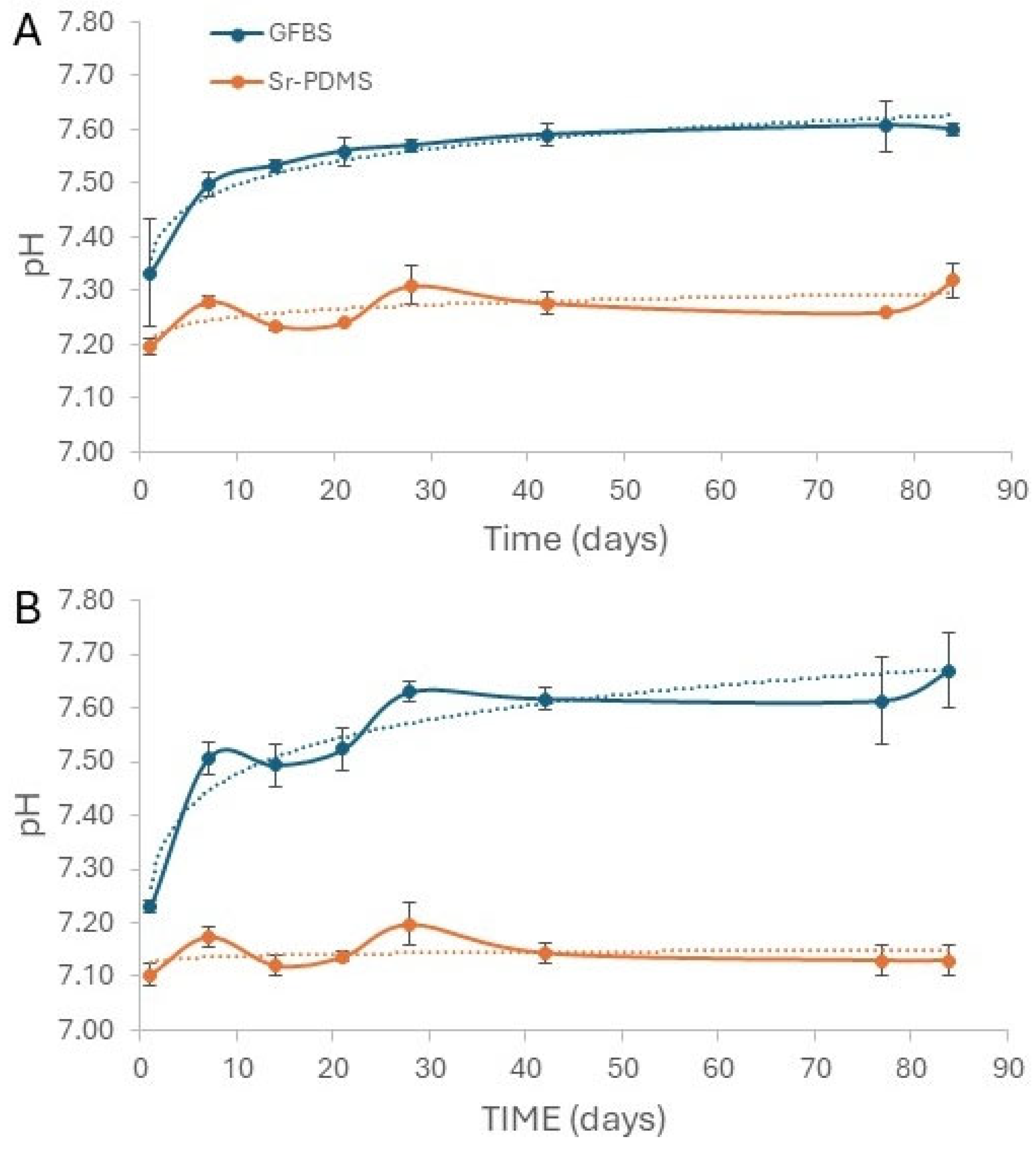 Both sealants caused an increase in pH value in the immersion solution, with the increase being greater for GFBS, presumably due to the higher Na+ ion content. From Hench’s earlier research, the first stage in glass degradation is Na+ ion exchange for H+, which leads to the increase in pH. Therefore, a higher Na+ content in 45S5 will cause a faster and more pronounced alkaline pH rise.
