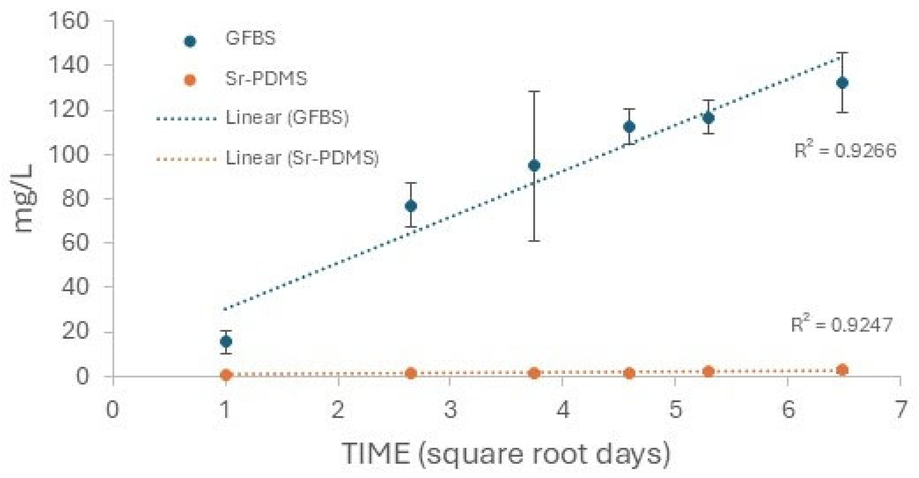 A likely explanation for this can be found in the sodium ion release data, which shows a square root time dependence indicative of a diffusion process. Sodium salts do not precipitate (unlike Ca2+ and PO43−). Therefore, assessing Na+ ion release can help determine the degradation and solubility of a material. Linear regression was applied to the sodium ion release against the square root time, yielding a correlation coefficient close to 1 (0.9615 for GFBS and 0.9514 for the novel strontium sealer). The gradient of the Na+ ion release from GFBS was 50 times greater than that of the novel sealer. This explains why the solubility of GFBS was higher than that of the novel sealer. It is important to acknowledge that although both sealants meet the ISO standards for solubility, the data from this study show a continuous ion release profile over a 3-month period. This means that as further ions are released, the solubility of the material increases over time, which can have a significant impact on the sealing properties of the sealer. The GFBS sealant could exceed a solubility range of 3% over a period of 3 months, as the material’s solubility already reached 1.77% after only 24 h immersion. When assessing future materials, consideration should be given to extending the immersion time (to exceed 24 h) before assessing solubility, as this could have significant clinical implications.