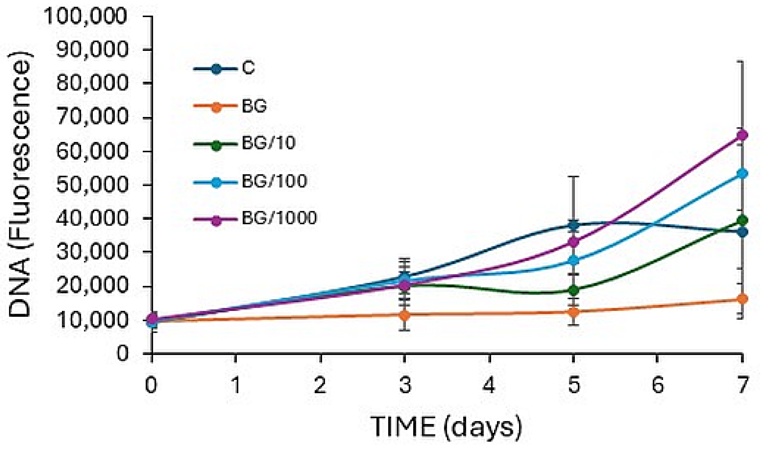 Initially, a dose–response investigation of cell proliferation in response to exogenous BG was conducted. A stock of 75 mg BG in 50 mL DMEM was prepared and left at 37 °C for 7 days. It was then filter sterilised, and four 10-fold dilutions were prepared in a normal culture medium. For experimentation, 2000 cells per 100 mL were seeded in the wells of 96-well plates in the same medium and kept overnight. The following morning, maintenance media was replaced with either normal (control) media; osteogenic media (reduced FBS (only 1.5%) and the addition of 50 μg/mL ascorbic acid and 10 mM sodium β-glycerophosphate); or the BG-conditioned osteogenic media (n = 6 wells per treatment group).