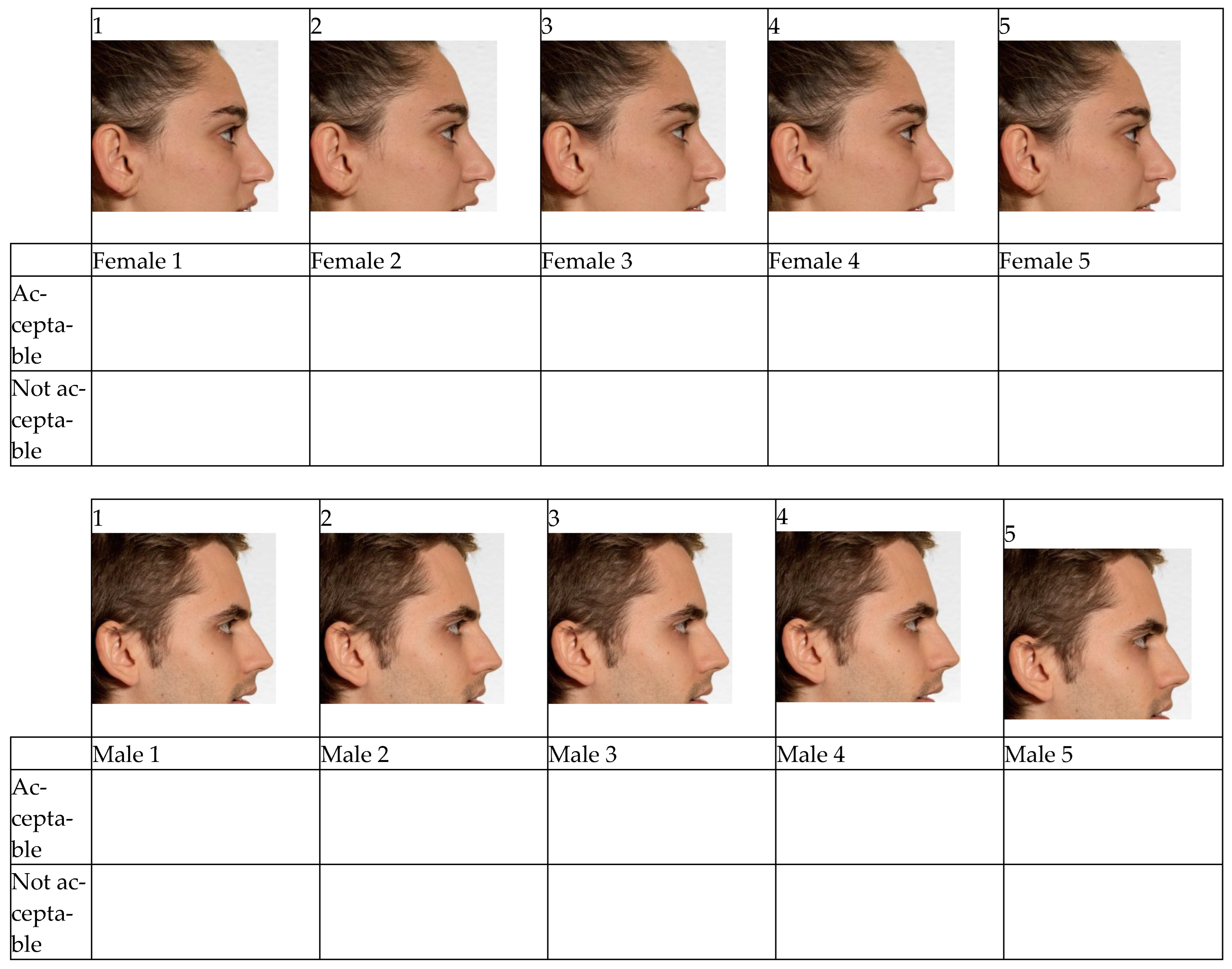 - Nomura, M.; Motegi, E.; Hatch, J.P.; Gakunga, P.T.; Ng’ang’a, P.M.; Rugh, J.D.; Yamaguchi, H. Esthetic preferences of European American, Hispanic American, Japanese, and African judges for soft-tissue profiles. Am. J. Orthod. Dentofac. Orthop. 2009, 135, S87–S95. [Google Scholar] [CrossRef] [PubMed]