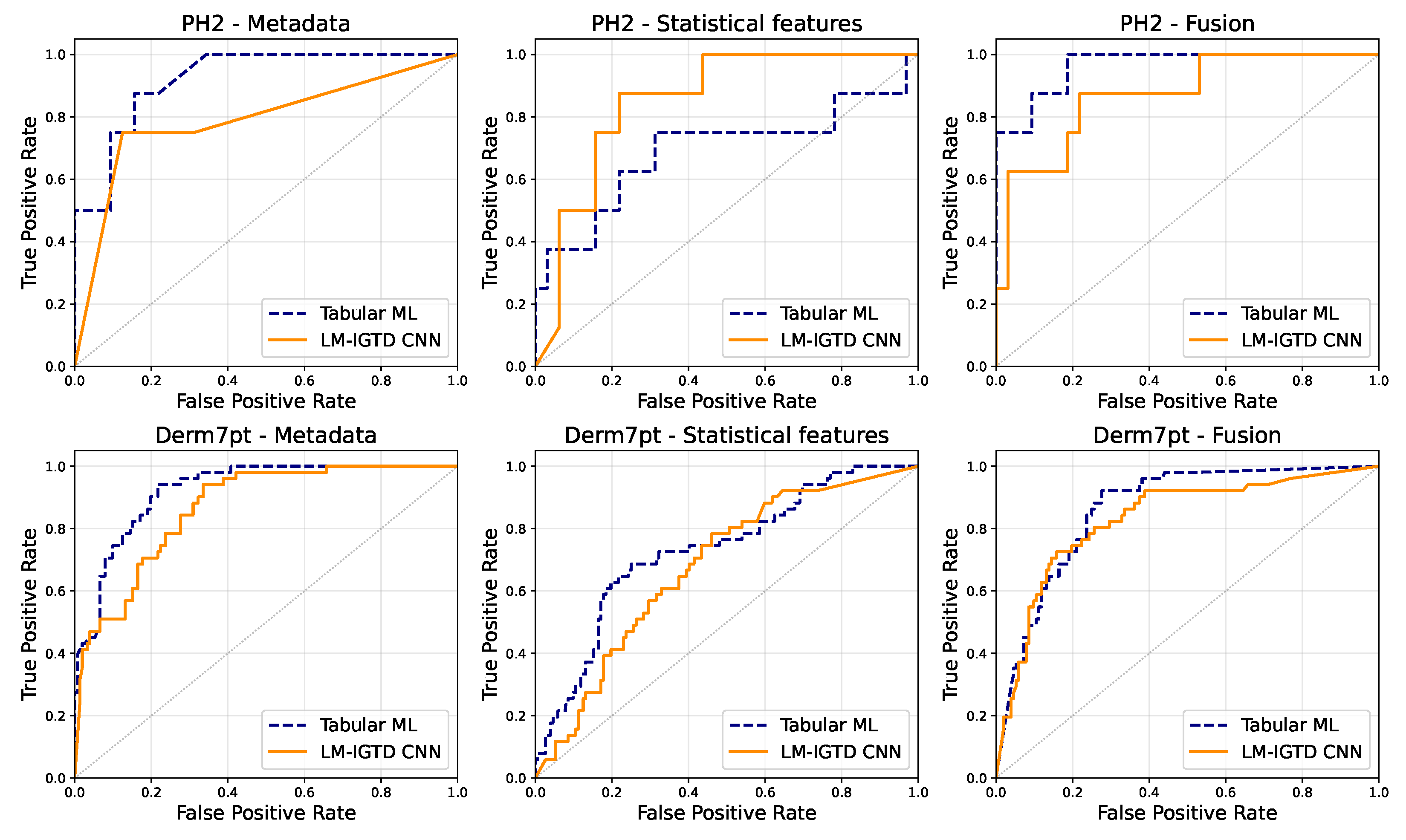For the PH2 dataset, the ROC curves reveal similar discriminative behavior across modalities, with neither approach consistently outperforming the other. In some modalities—particularly statistical features—both curves overlap substantially, while in the fusion setting the curves intersect, reflecting different sensitivity–specificity trade-offs rather than a consistent dominance of either approach. For the Derm7pt dataset, tabular ML models tend to achieve higher true-positive rates at low false-positive rates, especially in the metadata and statistical feature modalities. Nonetheless, LM-IGTD–CNN models remain competitive and converge toward similar performance levels at higher thresholds.
