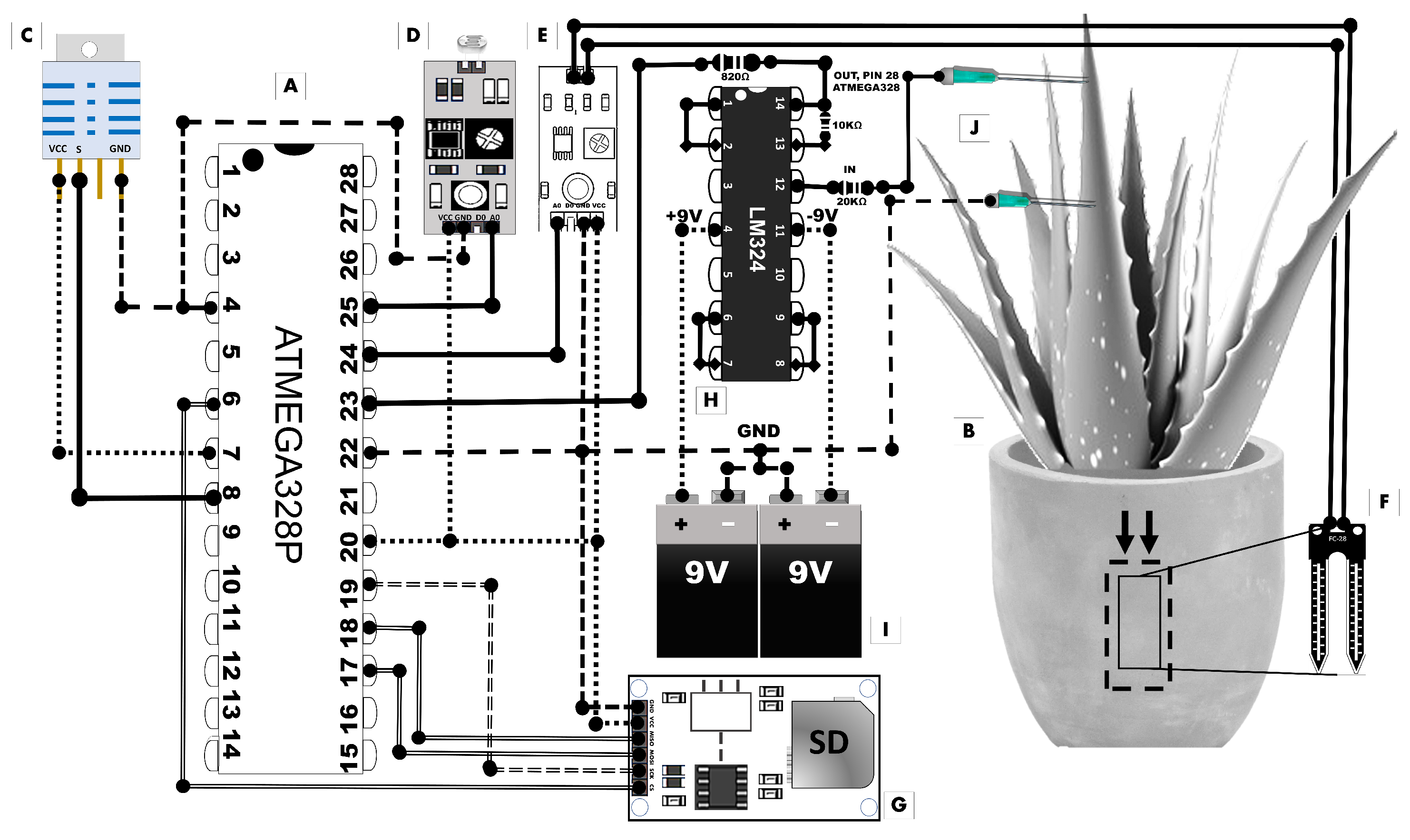 - Electronic equipment. Once the electrodes are in place, the micro SD storage drive is inserted and the equipment is turned on. It is essential to allow a 60–120 min acclimation period for the plant to recover from electrode insertion wounding and re-establish baseline electrophysiological activity. Once this is done, data is acquired for 20 min, obtaining a sample every 1 s.