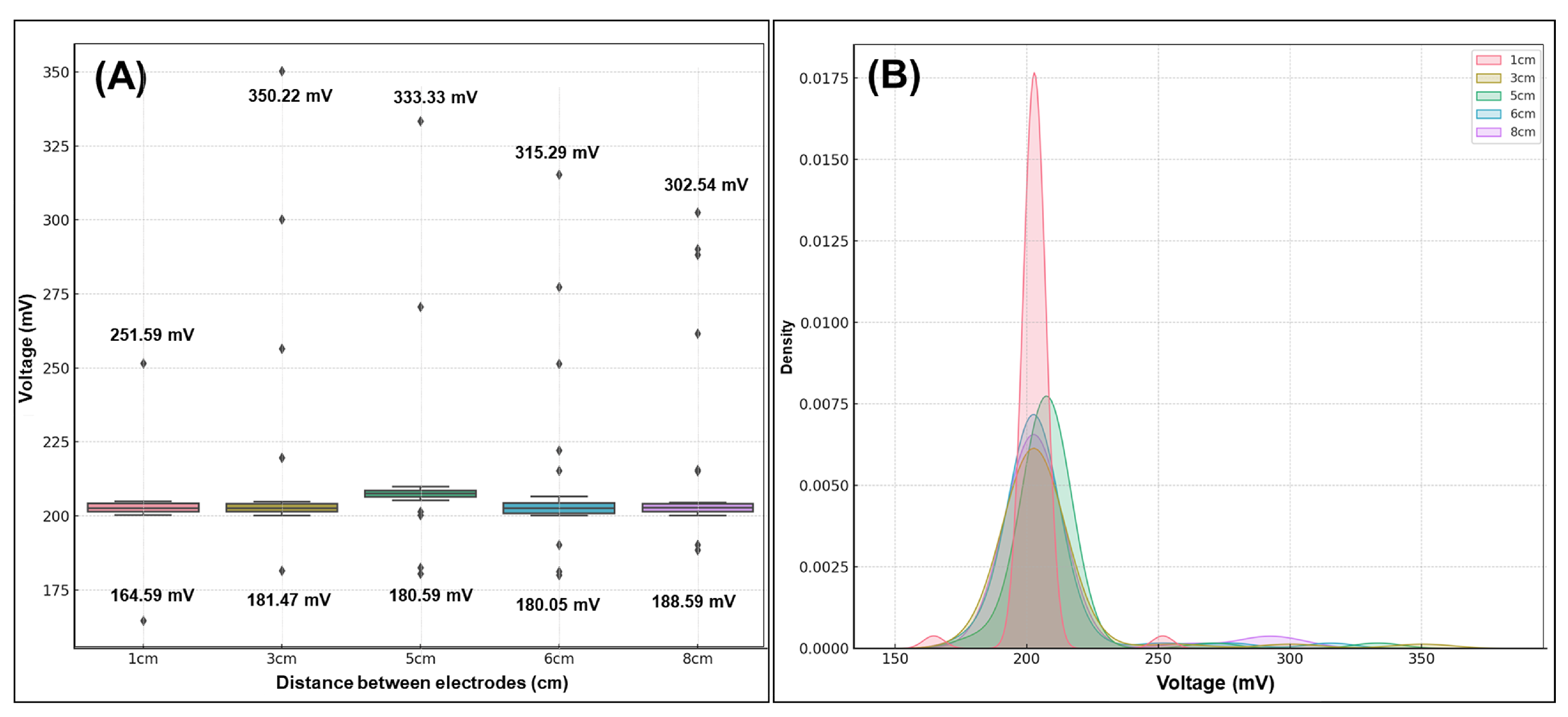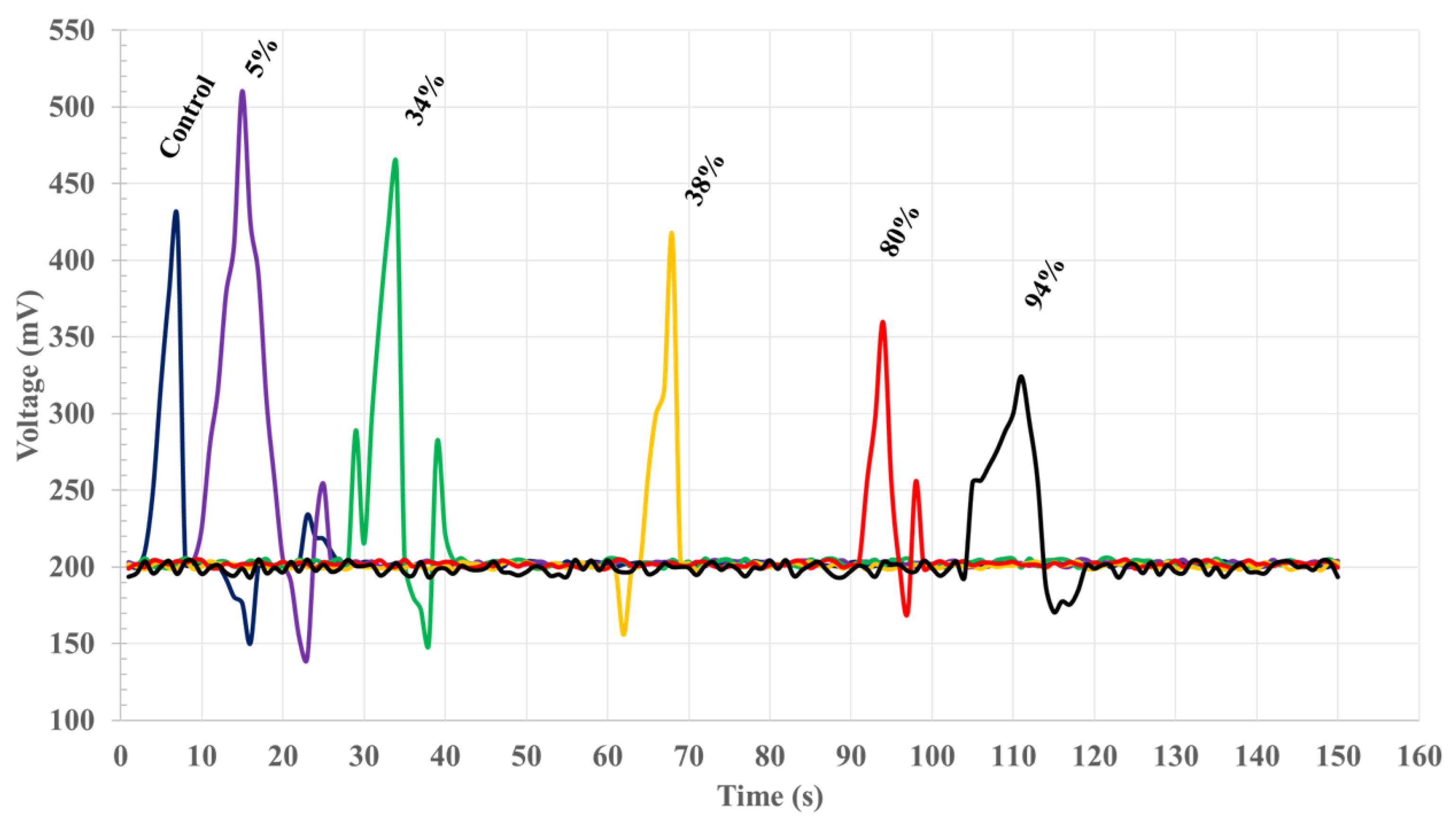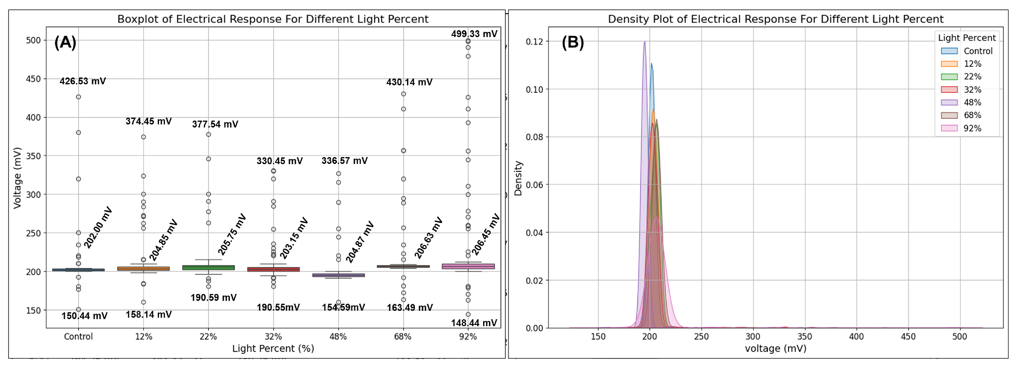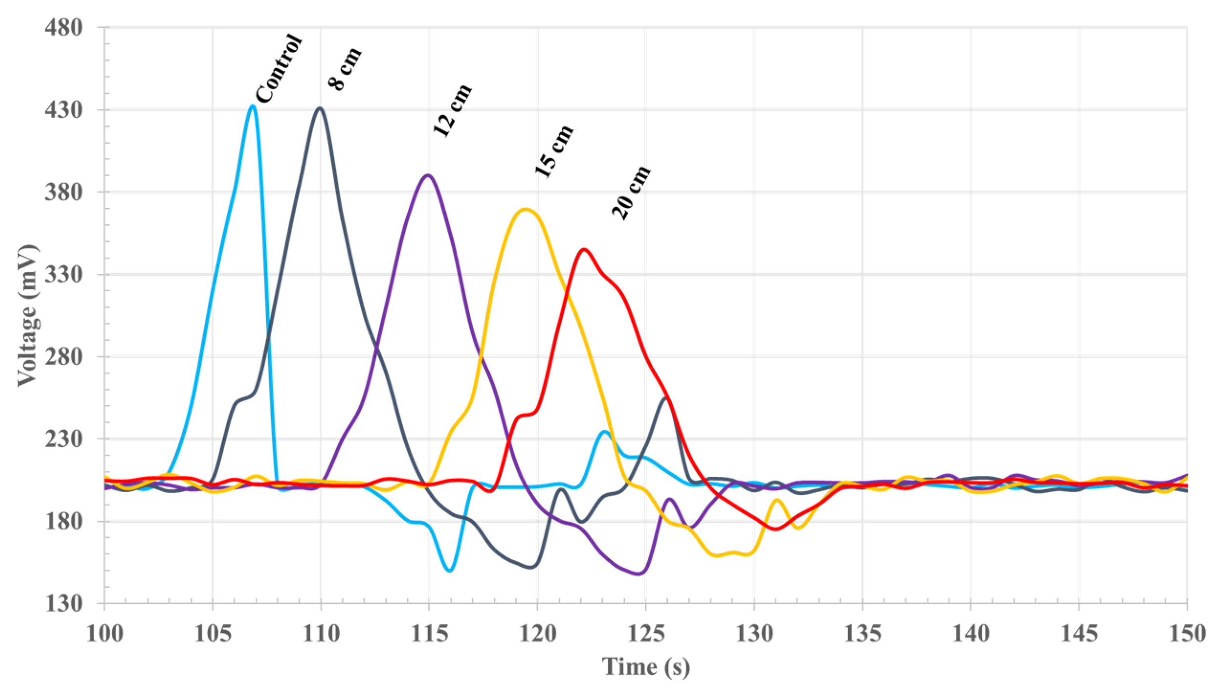- Experiments and voltage condition variations. Once the electrodes were inserted, some additional characteristics of the measurement environment were recorded, such as a soil moisture of 60% at temperature of 25 °C with humidity of 37.9% and an LDR module resistor of 7 kΩ. Subsequently, the variations in the different conditions of stress and the recording of the biopotentials were carried out. The experiments are described in the subsections below.