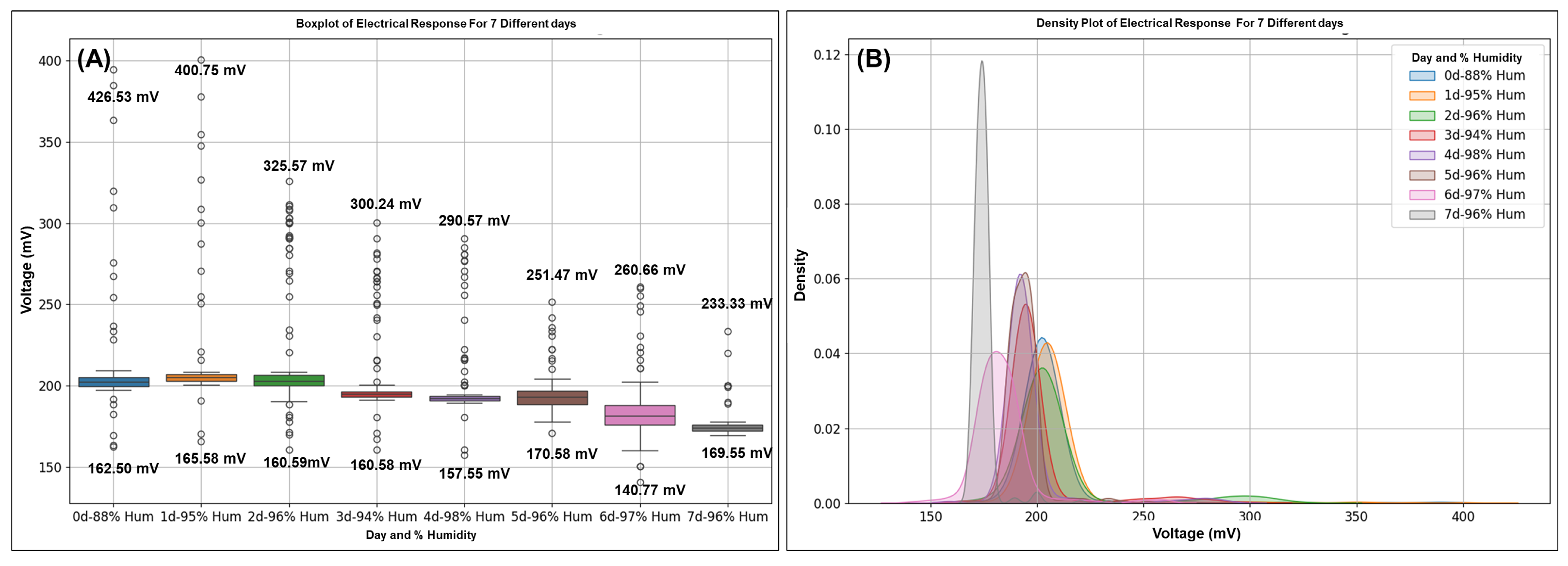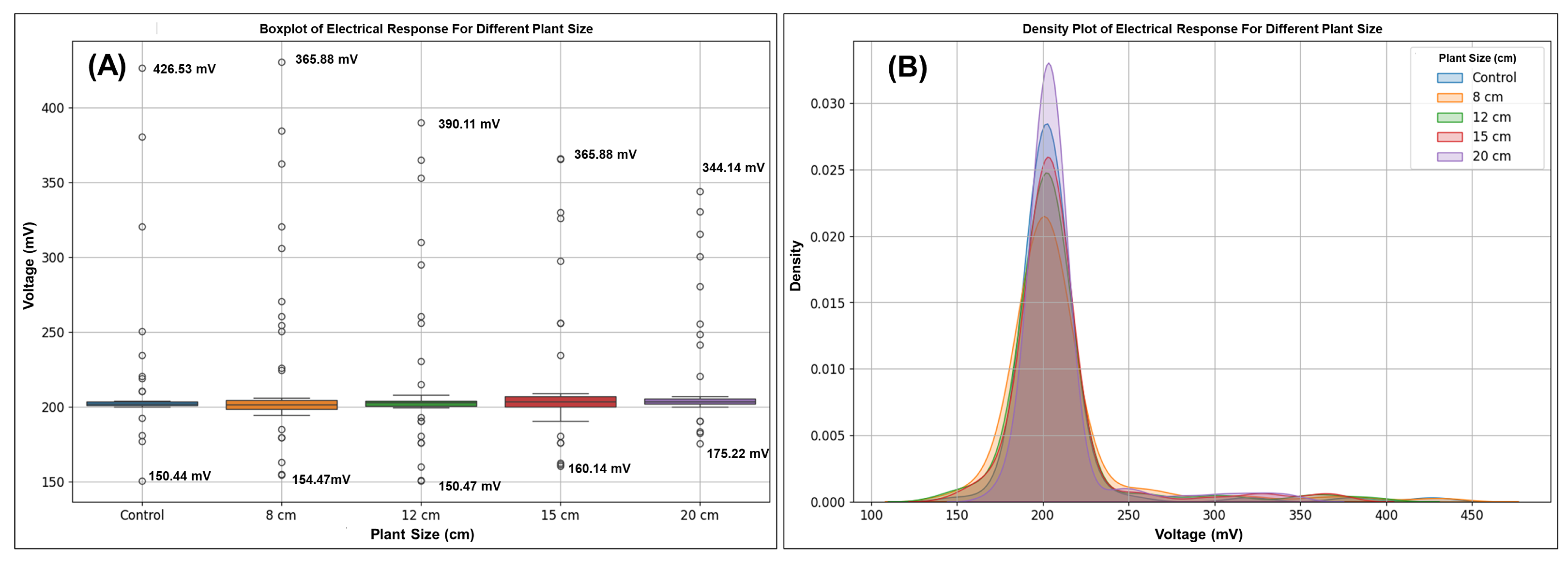 - Conditions of the Aloe vera plant. Mature Aloe vera plants grown under laboratory conditions in Zacatecas, Mexico, were used. Plants had an approximate height of ∼40 cm and uniform green coloration without visible tissue damage. For baseline/control recordings, leaves of approximately 7–8 cm length (and 3–4 cm width) were preferentially selected; for the leaf-size experiment, leaves were selected according to the predefined length categories (8, 12, 15, and 20 cm).