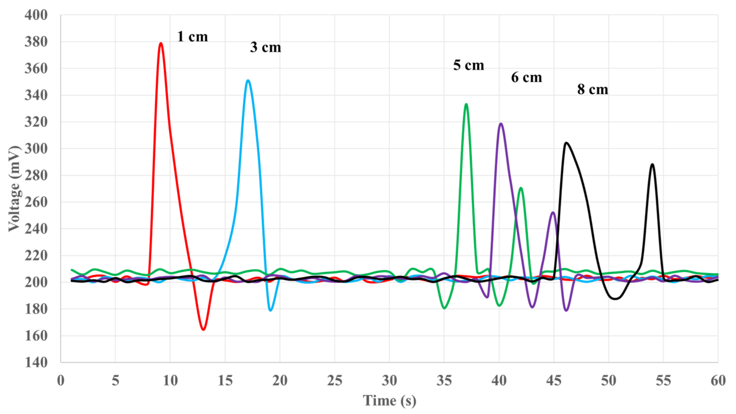 - Position of the electrodes. The first electrode is inserted into the Aloe vera leaf, near the stem, about 1 cm from the stem. The second one is inserted into the same Aloe vera leaf, near the tip of the leaf and in the direction of the first electrode. The distance between the tips of the two electrodes was 5 cm. The penetration of the electrodes was approximately 0.2 cm. See Figure 3.