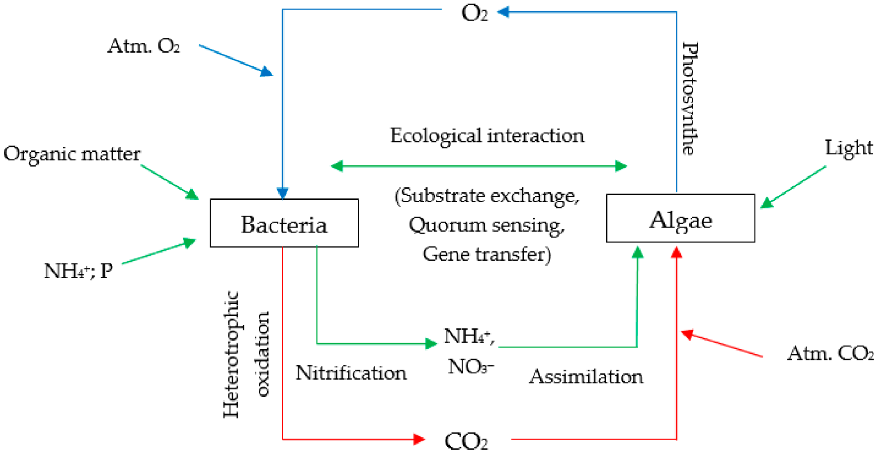 | Mutualism—nitrification coupling | Nitrifying bacteria—microalgae | NH3 → NO2− → NO3− ↔ O2 | Enhanced N assimilation | O2 supply from photosynthesis | Higher wastewater treatment efficiency | [40] |