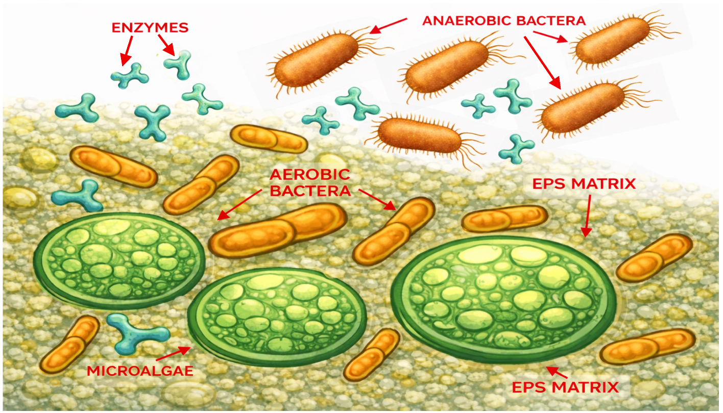 | Organic matter degradation → remineralisation | Heterotrophic bacteria—microalgae | Hydrolysis/mineralisation → NH4+, NO3−, PO43− | Higher N and P availability | DOC utilisation | Sustained nutrient cycling | [33] |