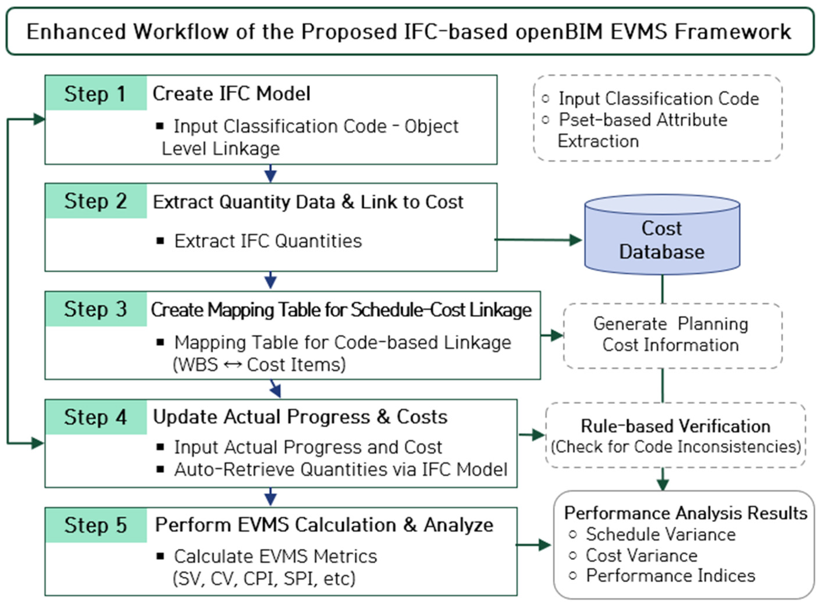 This study developed and validated an openBIM-based EVMS framework utilizing IFC to enable integrated schedule–cost management within a single BIM-centered environment. Unlike previous studies that primarily relied on conceptual integration approaches or software-dependent workflows, the proposed framework establishes a structured methodology that systematically links WBS information and cost data through classification codes and property-level attributes embedded in the IFC model.