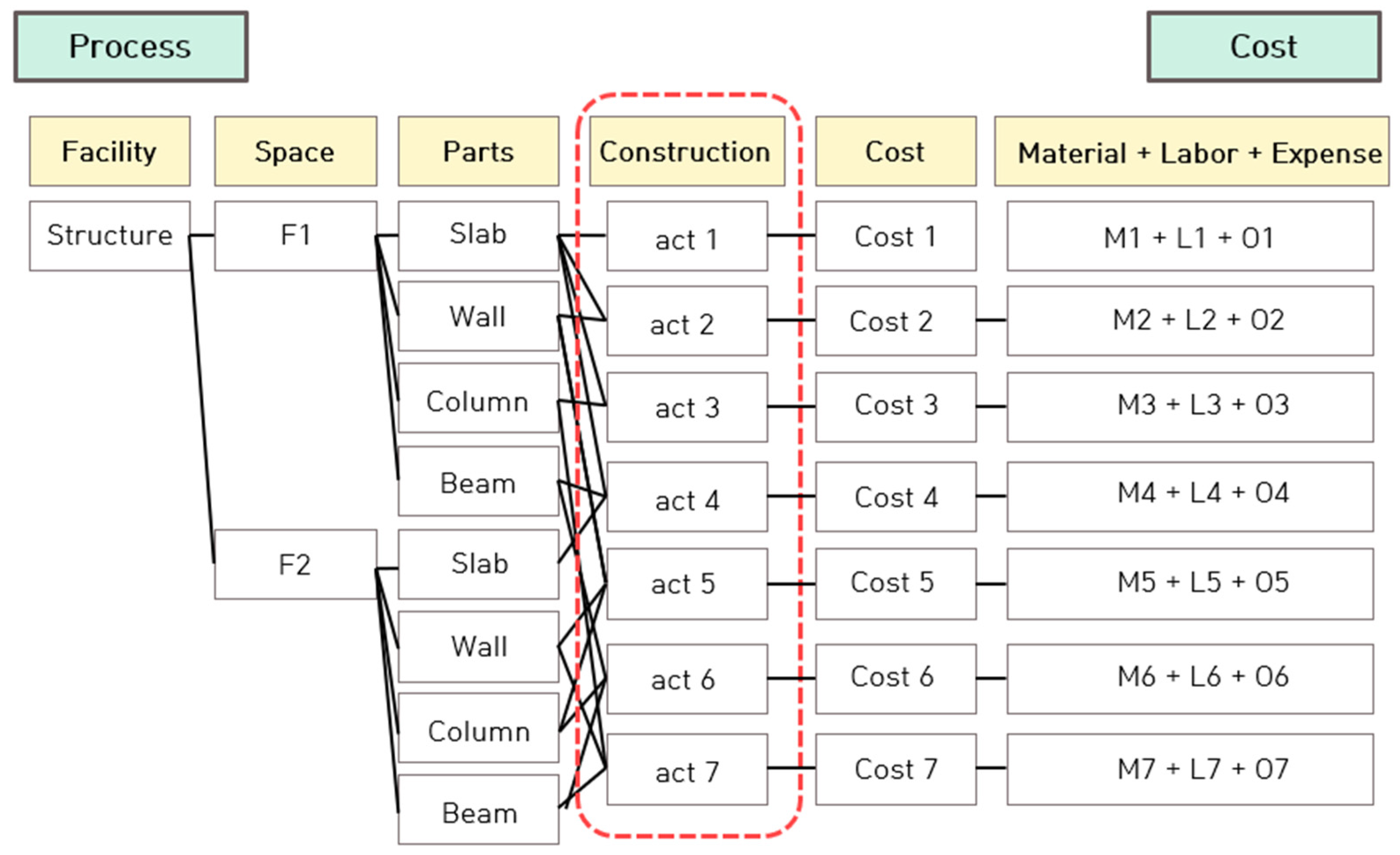19] proposed a model that links information using the concept of ratio allocation to solve the problem of integrated management of processes and costs, which is difficult owing to the discrepancy between the cost breakdown structure (CBS) and work breakdown structure (WBS). However, it does not present a solution to the problem of detail level discrepancy between the CBS and WBS, and it is said that additional costs are required to connect processes and costs, reducing efficiency in information processing. Hendrickson [